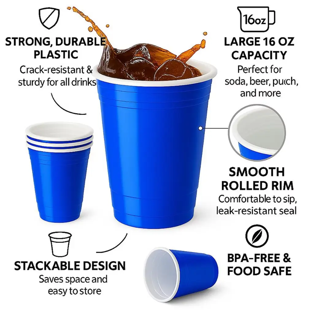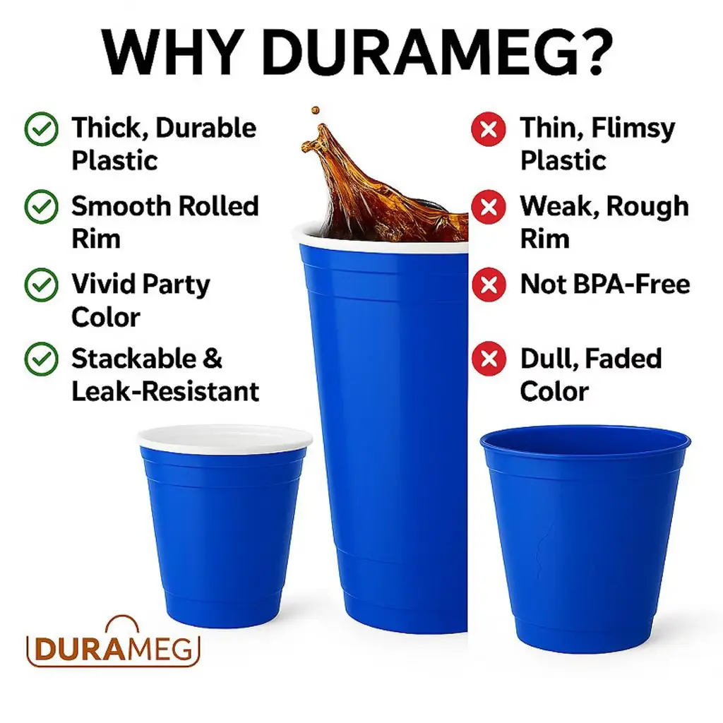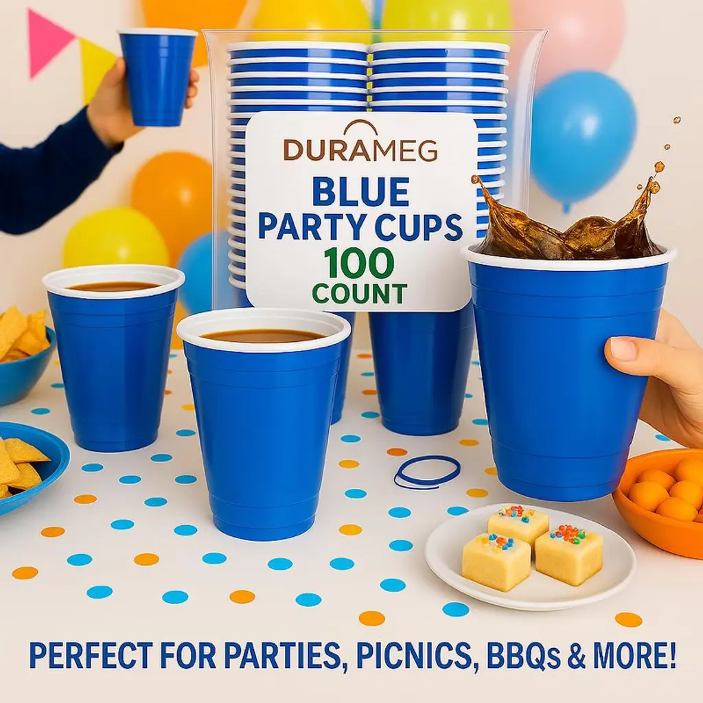 🧋 【100 PACK BLUE CUPS】 16 oz blue cups - Our vibrant and bold blue plastic disposable cups in 16 oz size add a touch of serenity to any beverage. With their opaque design, our blue cups make a statement and add fun to your drinks, letting the flavors and aromas shine. ✅ Impactful serving: 16 oz. Blue plastic cold cups make a bold statement at your bar or catered event. These cups create a striking presentation for your refreshing drinks and cocktails and are perfect for serving smoothies, milkshakes, iced tea, and sodas at your eatery. Their versatility makes them ideal for fruit salads, desserts, or appetizers. 💪 【STURDY & REINFORCED】 High-quality 16oz blue plastic cups made of durable PS material. These cups are BPA-free, non-liquid absorbing, and easy to clean for reuse. Their opaque design ensures no flavor or aroma is compromised, and they remain odorless, perfect for enjoying your favorite drinks, from rich coffee to bold cocktails. ✅ Practically unbreakable: Crafted from ultra-durable PS plastic, these blue cups are engineered to withstand the rigors of use, resisting cracks and breaks in guests' hands. Say goodbye to customer complaints and worries about shattered cups and hello to a stress-free experience. Plus, our PS material is recyclable, reducing waste and promoting sustainability. 👍 【EASY TO SIP & HOLD】 Blue plastic cups with a rolled rim for added rigidity and a comfortable sipping experience. Slimmer bottom for easy grip and fit in cupholders. Compatible with various lids.✅ Showstopping color: These blue cups add a fresh and natural touch to your beverages, perfect for impulse sales. 🚊 【TO GO & TRAVEL-FRIENDLY】 16-ounce blue plastic cups, disposable and suitable for single or multi-use. Ideal for parties, events, and takeout.✅ Grab n Go…: Use these cups for conveniently packaging snacks like parfaits, salads, and yogurts.🥤 【COLD DRINK MULTI USE】 blue plastic cups for various cold drinks, such as water, beer, cocktails, smoothies, and more!✅ Rolled Rim: Ensures a comfortable drinking experience and secure fit with compatible lids for on-the-go applications. Compatible with standard lid sizes for easy serving. Durameg blue plastic cups offer durability, functionality, and quality at an economical price, suitable for various businesses. Durameg 16 oz Blue Plastic Cups – 100 Count Durameg 16 oz blue plastic cups offer a practical and sturdy option for serving a wide range of cold beverages. Made from high-quality plastic, these cups are engineered for strength and reliability, making them well-suited for daily use or event service. The vibrant blue color provides a clean, contemporary look, while the ergonomic design ensures a comfortable grip. Perfect for iced coffee, soft drinks, juices, or slush beverages, these disposable cups are a convenient choice for households, parties, foodservice operations, or gatherings. Pack includes 100 disposable cups for single-use convenience.