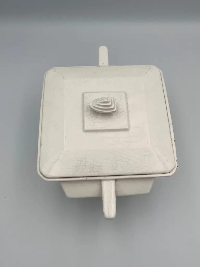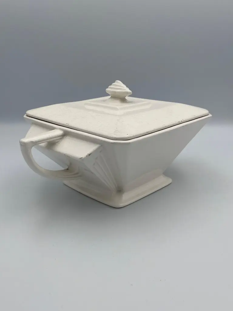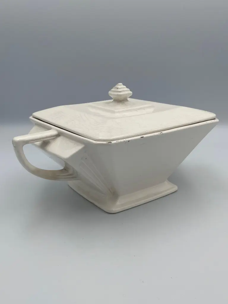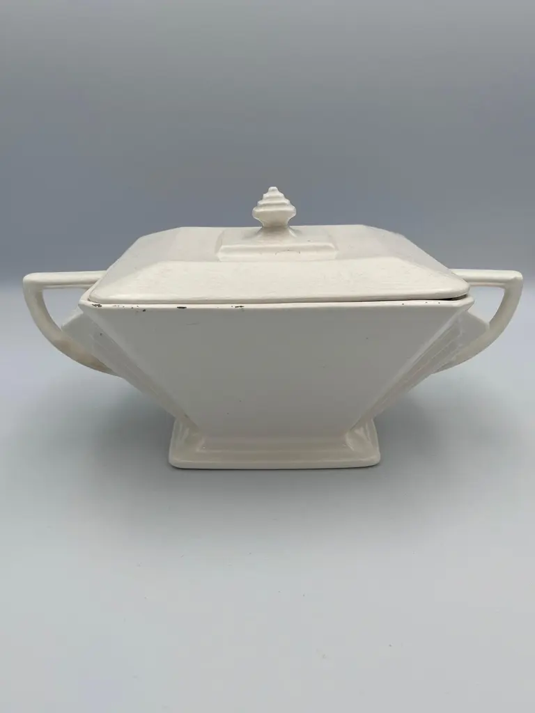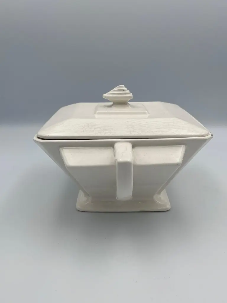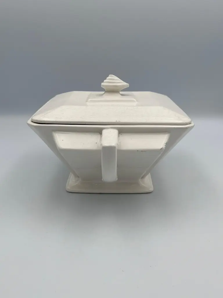 Early 20th Century Art Deco Streamline Cream Covered Serving BowlThis elegant early 20th century Art Deco covered serving bowl exemplifies the streamline moderne aesthetic, with its dramatically flared silhouette, sculptural geometry, and clean, modern lines. Crafted in a rich cream glaze, the form expands from a footed base, fanning outward with striking symmetry. The angular, curved handles jut out before sharply turning inward at a precise 90-degree angle—an architectural touch that adds both function and flair.The lid is a standout feature, shaped as a perfect square and topped with a sleek, minimalist finial that evokes a geometric abstraction of a boat or vessel. This subtle nautical reference is in keeping with the machine-age inspirations of streamline design, popular in the 1930s and 1940s.Though unmarked, the bowl was clearly produced with attention to design and proportion, reflecting the era’s Art Deco focus on both beauty and utility. It is in overall good vintage condition with age-appropriate crazing throughout and a faint hairline crack in the glaze at one corner of the lid. The base shows light shelf wear, and there are a few small darkened marks along the upper rim, which do not detract from its bold presentation.An excellent display or serving piece, this streamlined Art Deco ceramic bowl would elevate any vintage dining collection or design-conscious interior. Perfect for collectors of Art Deco pottery, ceramic serveware, or early 20th century American and European decorative arts.
