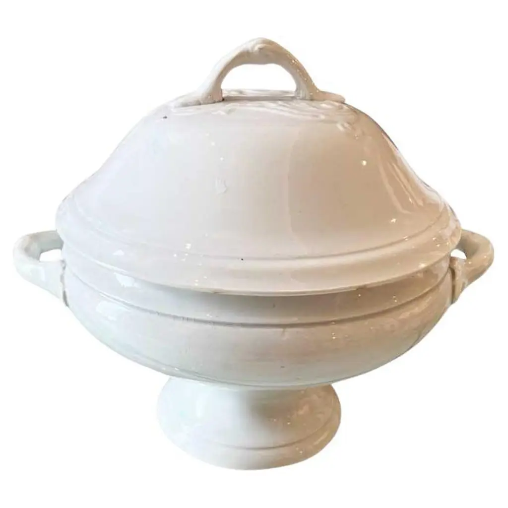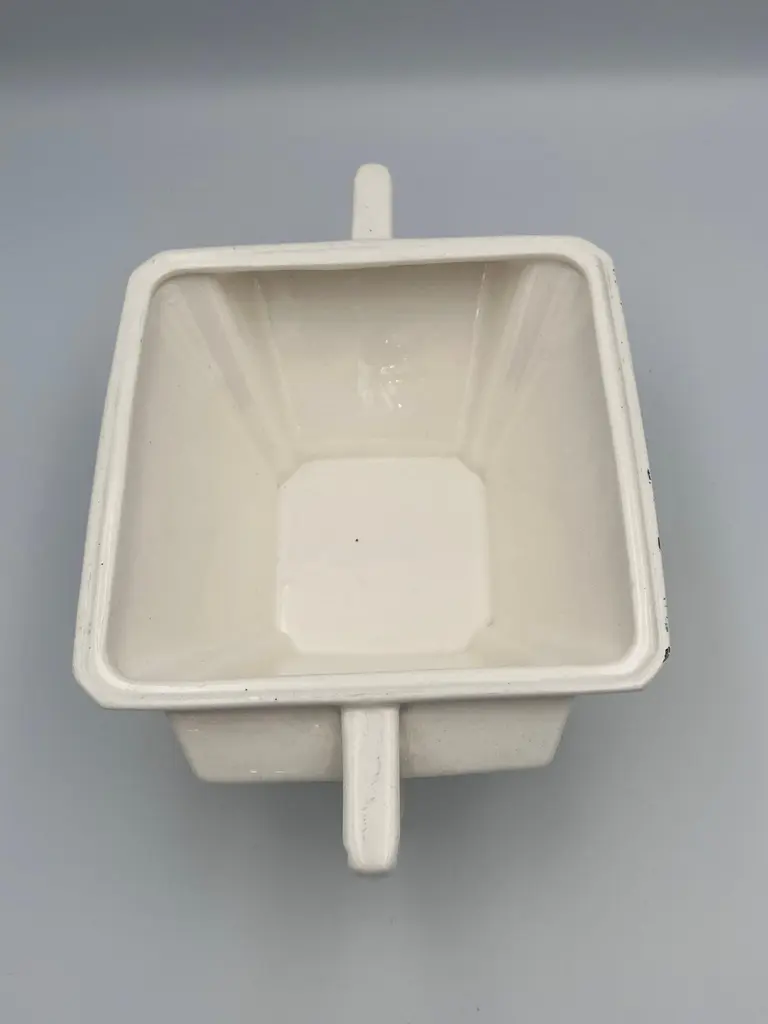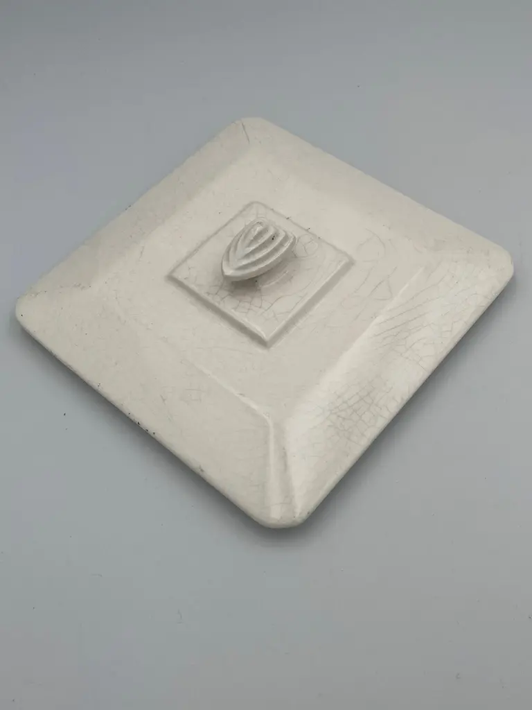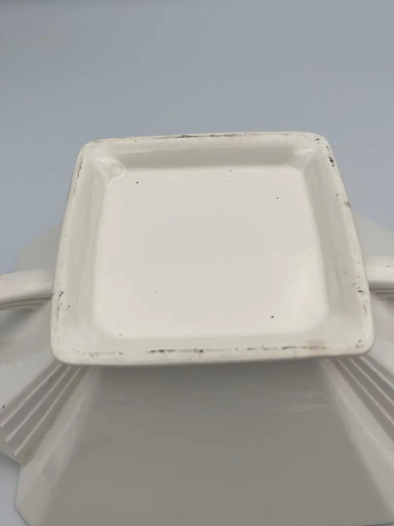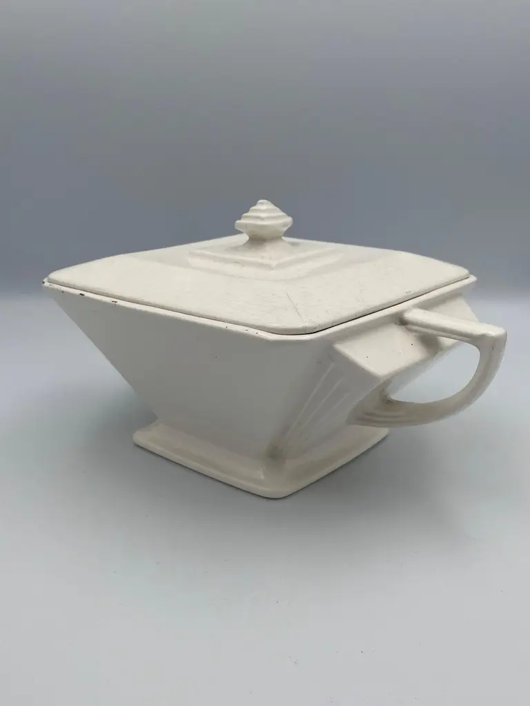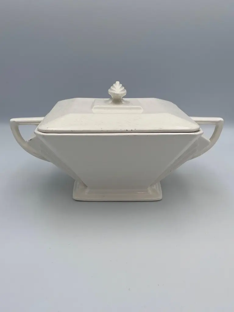 Early 20th Century Art Deco Streamline Cream Covered Serving BowlThis elegant early 20th century Art Deco covered serving bowl exemplifies the streamline moderne aesthetic, with its dramatically flared silhouette, sculptural geometry, and clean, modern lines. Crafted in a rich cream glaze, the form expands from a footed base, fanning outward with striking symmetry. The angular, curved handles jut out before sharply turning inward at a precise 90-degree angle—an architectural touch that adds both function and flair.The lid is a standout feature, shaped as a perfect square and topped with a sleek, minimalist finial that evokes a geometric abstraction of a boat or vessel. This subtle nautical reference is in keeping with the machine-age inspirations of streamline design, popular in the 1930s and 1940s.Though unmarked, the bowl was clearly produced with attention to design and proportion, reflecting the era’s Art Deco focus on both beauty and utility. It is in overall good vintage condition with age-appropriate crazing throughout and a faint hairline crack in the glaze at one corner of the lid. The base shows light shelf wear, and there are a few small darkened marks along the upper rim, which do not detract from its bold presentation.An excellent display or serving piece, this streamlined Art Deco ceramic bowl would elevate any vintage dining collection or design-conscious interior. Perfect for collectors of Art Deco pottery, ceramic serveware, or early 20th century American and European decorative arts.