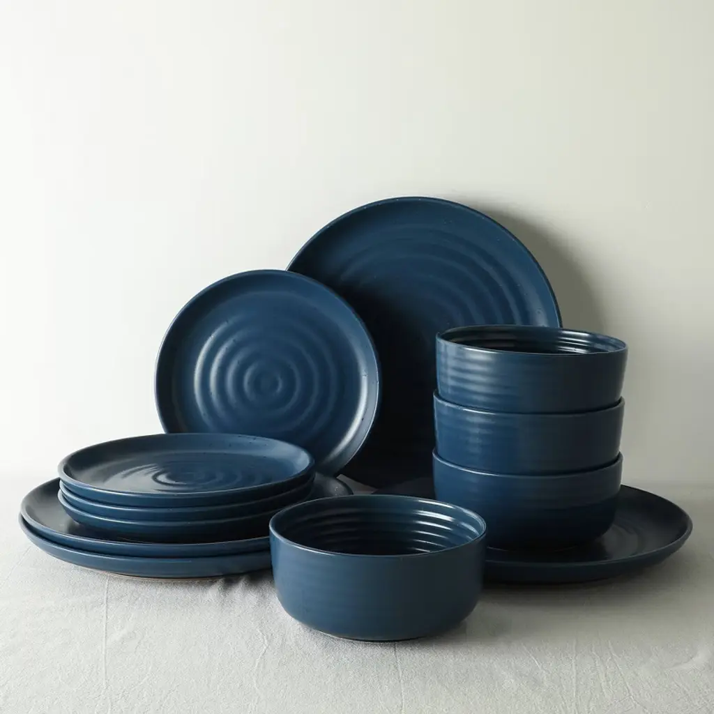 Each piece in the Earth & Clay Ion Blue Stoneware Dinnerware Set is designed to elevate your everyday meals with timeless style and rustic charm. Crafted from durable ceramic stoneware and finished with a semi-matte reactive glaze, this 12-piece set features a signature speckled effect and unique circular grooves inspired by hand-thrown pottery. The rich blue hue adds depth and elegance to your table, while subtle variations in each piece ensure no two dishes are exactly alike.Designed for both everyday use and special occasions, Ion transitions seamlessly from casual breakfasts to formal dinners. The set includes four 10.4" dinner plates, four 8" salad plates, and four 6 fl.oz bowls—an essential assortment for modern dining. Whether you're hosting guests or enjoying a quiet night in, this set delivers beauty, function, and long-lasting quality.Ion is microwave and dishwasher safe, built to handle the demands of real life without sacrificing style. Its earthy tones and artistic finish make it a thoughtful gift and a versatile addition to any home. At Earth & Clay, we believe that great design should be accessible—this collection blends affordability with artisanal character, making luxury an everyday experience.Includes: 4 Dinner Plates (10.4"), 4 Salad Plates (8"), 4 Bowls (6 fl.oz)Material: StonewareColor: BlueDishwasher & Microwave Safe