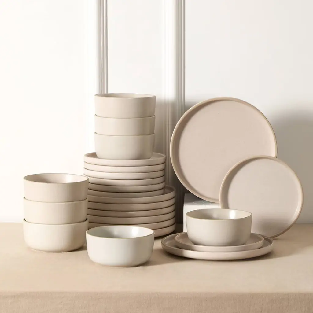 Set a harmonious table from morning to night with Earth & Clay's Amber Stoneware 12-Piece Dinnerware Set. With undeniable modern appeal, each piece is graced with subtle speckles and beautiful colored rims, for a sleek, simple, and classy look. If that weren't enough to add more depth and texture to your everyday dining, Amber also has a one-of-a-kind reactive glaze finish. Available in four exciting colorways, this set includes 4 10.4" dinner plates, 4 8" salad plates, and 4 6" bowls.