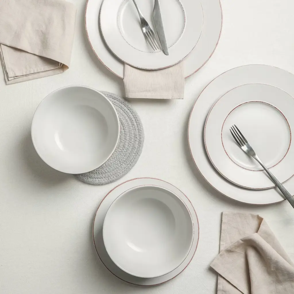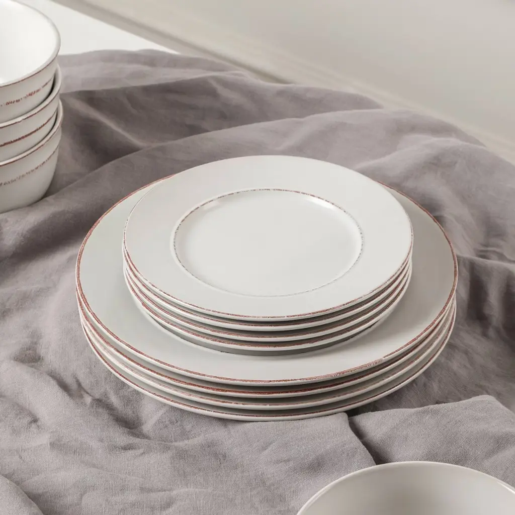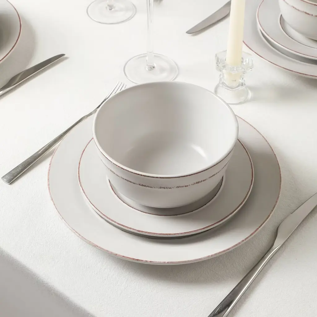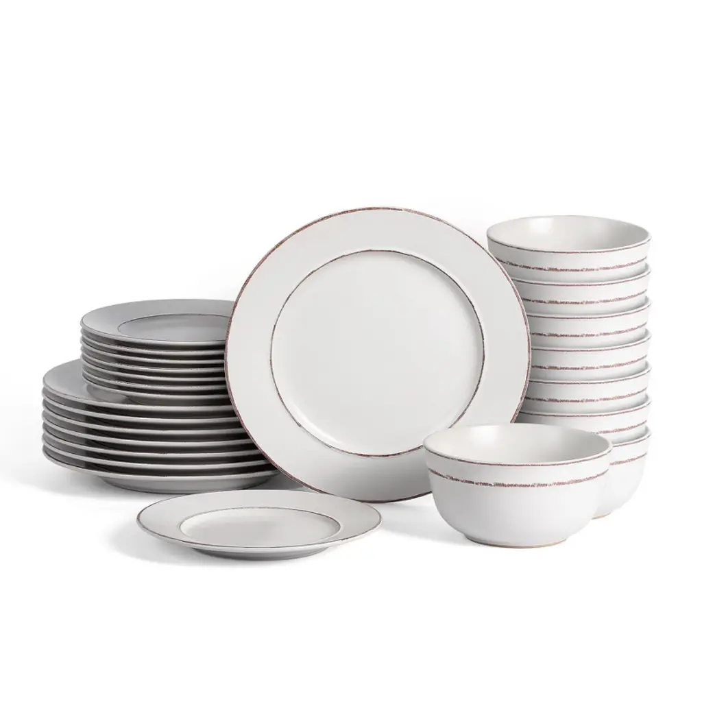 With effortless farmhouse appeal, Earth & Clay's Hazel Stoneware 24-Piece Dinnerware Set draws out the warm, relaxing, and cozy character in your space. Accented with unique hand-painted rims and earthy semi-matte finish, this set includes 8 large round 10.5” dinner plates, 8 round 8” salad plates, and 8 large 6.3" 34.8 fl.oz bowls. Perfect for casual or country-inspired dining spaces.