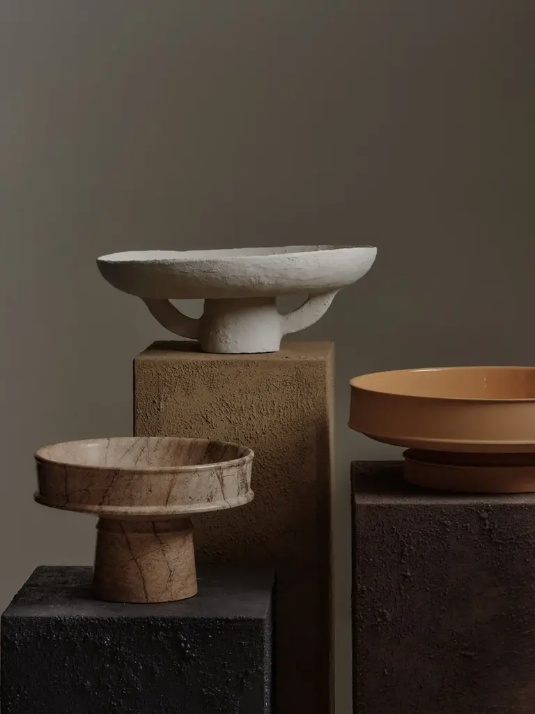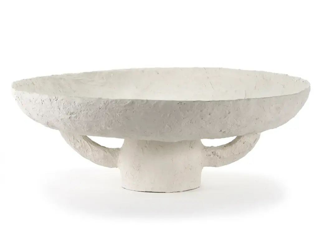 Earth is a round paper mache dish.This paper maché dish in off-white tells a story of crafts and craftsmanship.The Earth collection by Marie Michielssen stems from her love for paper, prints, and the reuse of materials. She has crafted vases, lamps, and decorative objects with a traditional character reflected in both the texture and the organic shapes. The poetic atmosphere created by the papier-mâché material beautifully balances these home décor pieces between art and design.