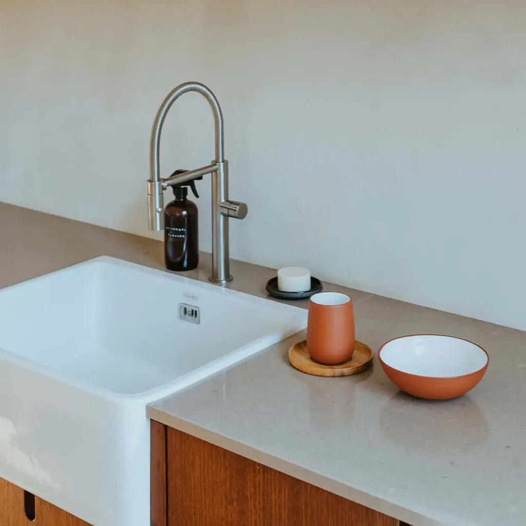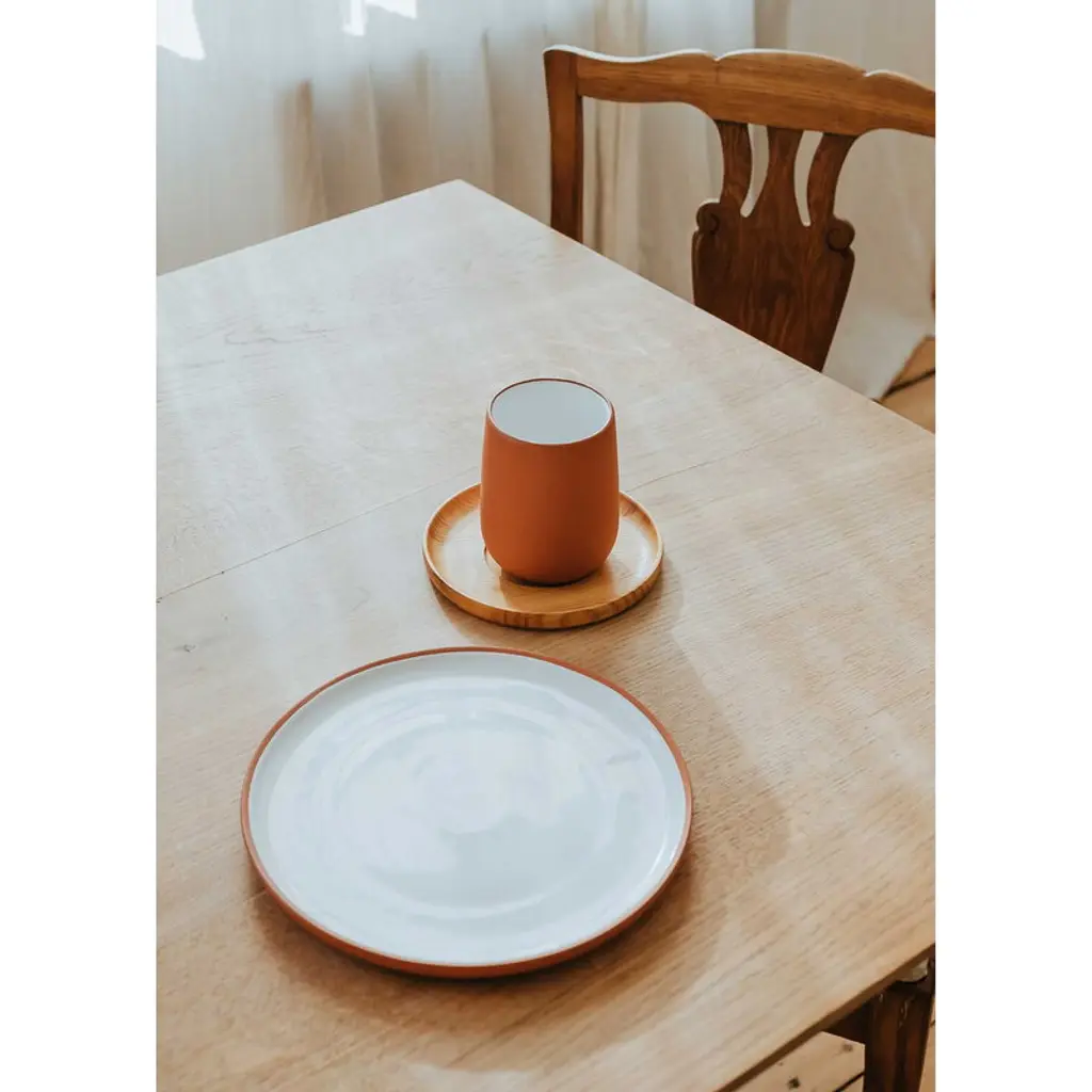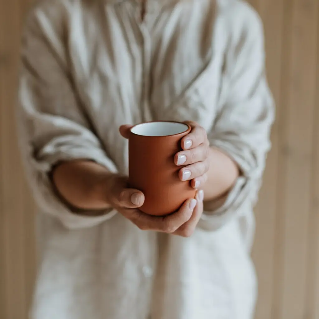 Vaidava's Earth collection combines Latvian ceramic traditions and minimalist Nordic design. Made of Latvian red clay, the Earth mug has been glazed with colored, lead-free glaze on the inside, and the unglazed outside has simply been polished smooth. The mug comes with a round wooden saucer made from ash. The natural tones and soft silhouettes of the Earth collection frame the food beautifully in both daily and festive table settings. Handmade in Vaidava’s own pottery in Latvia. Packed in a recycled cardboard box.
