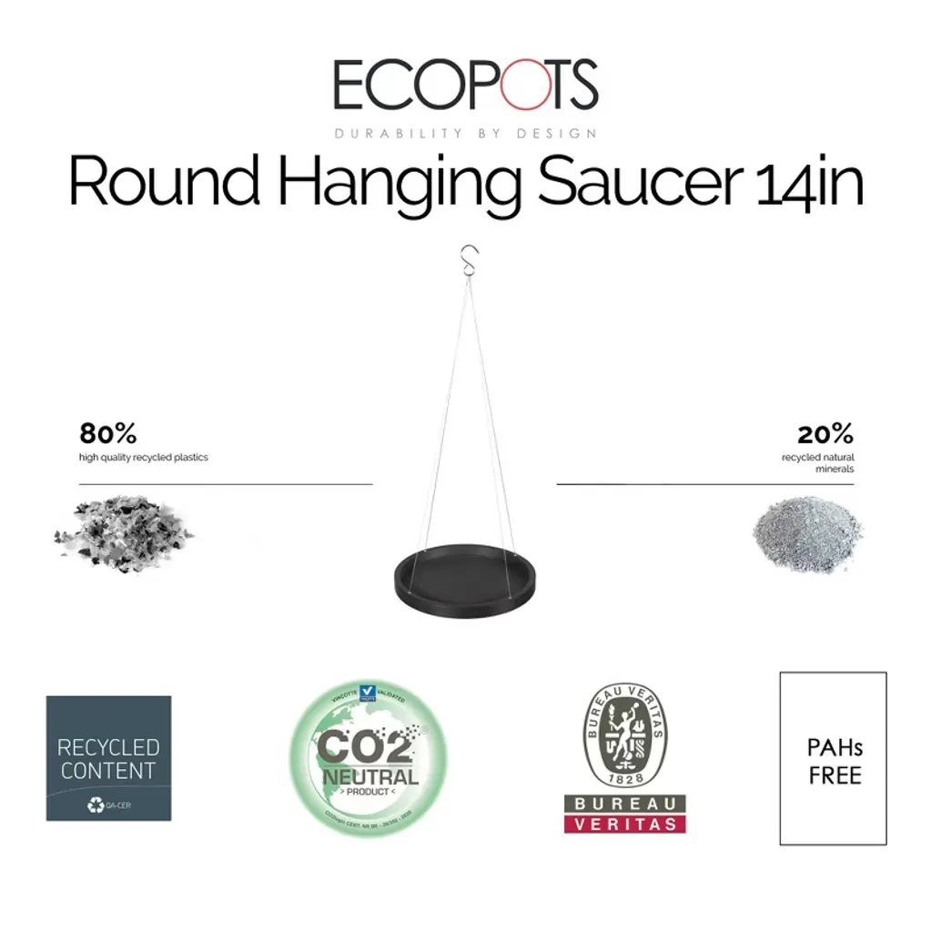 Ecopots Indoor/outdoor Round Recycled Plastic Modern Hanging Saucer, Dark Grey, 14"