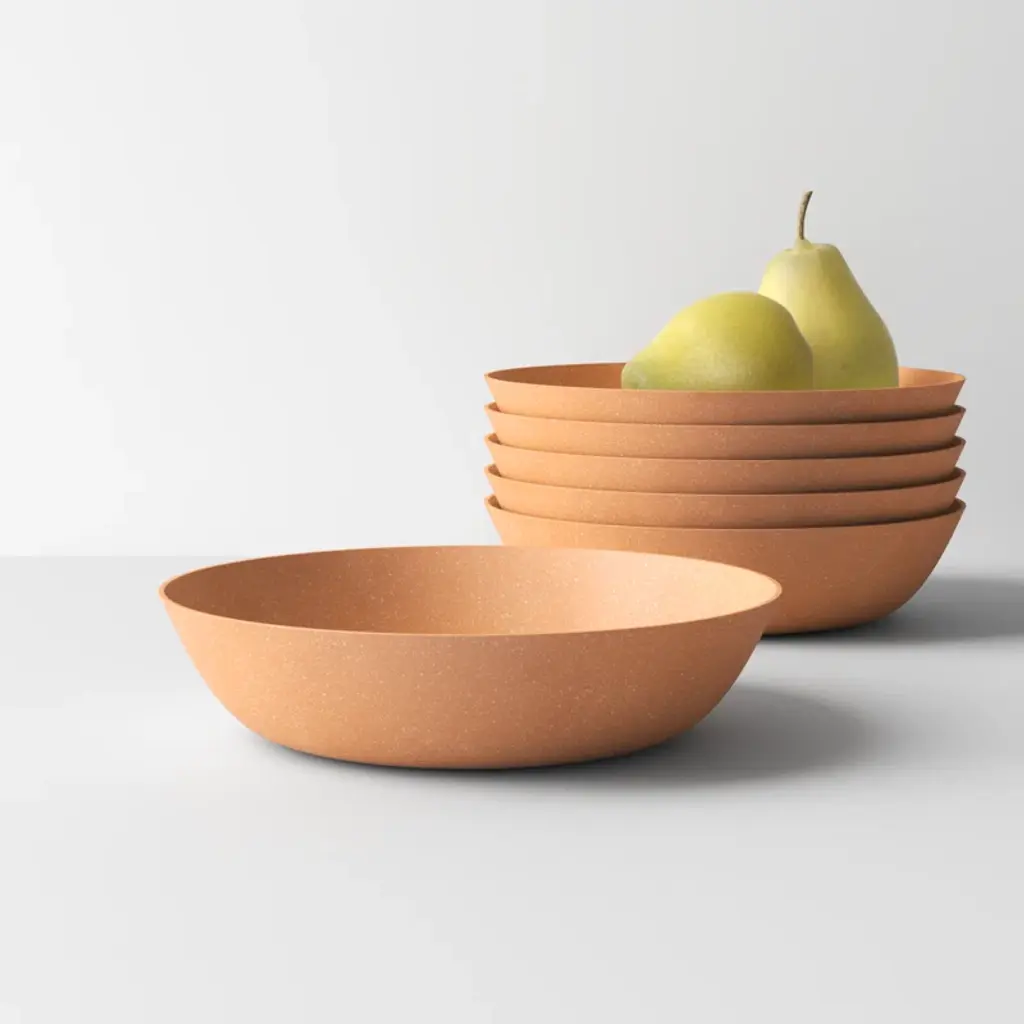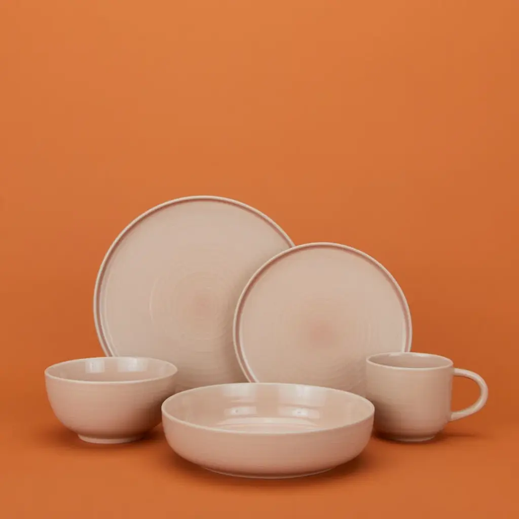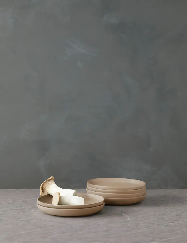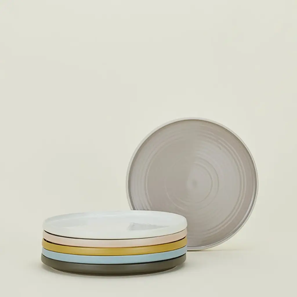 Everyday essentials, elevated. This set of four dinner plates is crafted from durable stoneware with soft concentric ripples and a subtly raised edge that evokes the feel of hand-thrown ceramics. The wide, flat shape is ideal for plating, and the streamlined design stacks neatly in your cabinet. Dishwasher, microwave, and oven safe. Available in a range of colors to mix + match.
