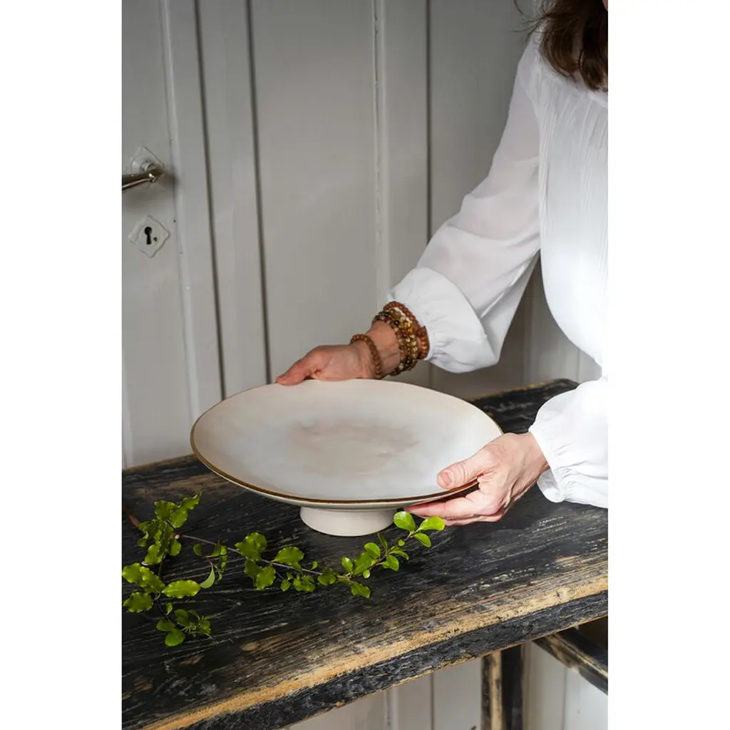 Heirol's Edge cake stand elevates your delightful desserts to the place they deserve. Decorated with gold-colored edges, the serving platter adds a touch of sophistication to both casual dinners and more festive tables. The Edge cake stand is part of the Nosse Ceramics for Heirol collection that features ceramic tableware. Made from eco-friendly stoneware, Edge tableware celebrates the perfection of imperfection with its uneven edges, alternating surfaces of matte and glossy and earthy tones that complement any table setting.