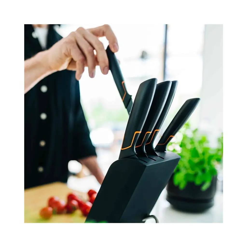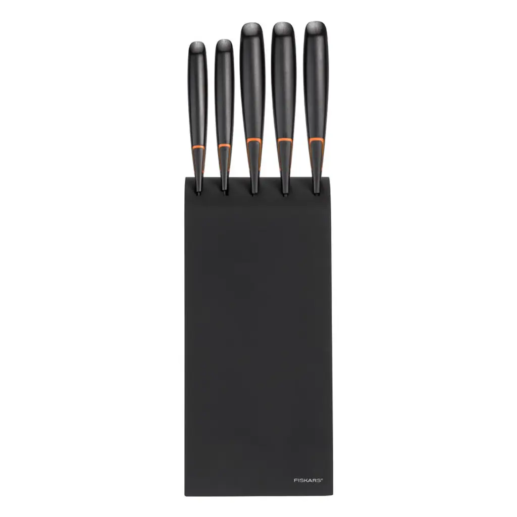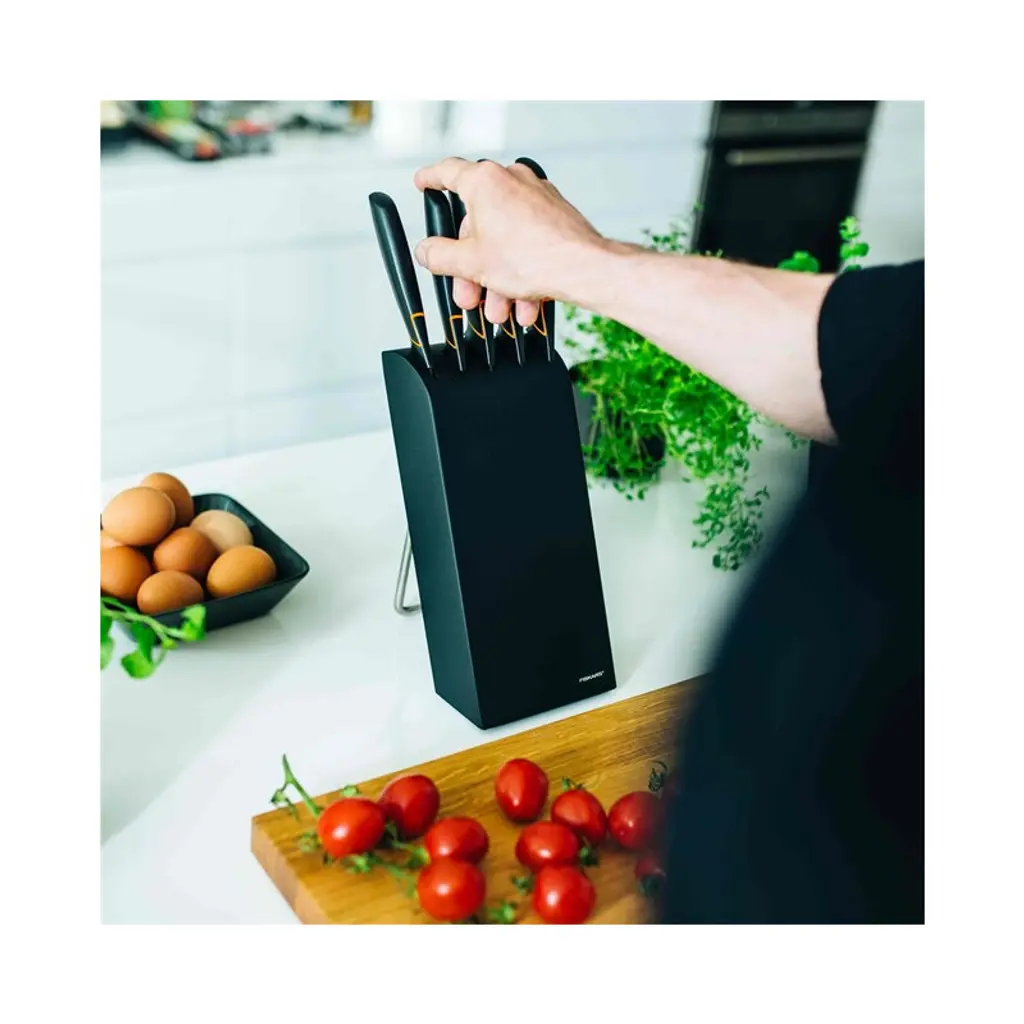 The Fiskars Edge knife block can be mounted on the wall or placed on the kitchen counter. The stylish knife block comes with five essential knives: a peeling knife, a tomato knife, a bread knife, a large chef's knife and a Santoku knife. The stainless steel blades are finished with an anti-stick coating, which makes the knives durable and easy to clean – in addition, the coating gives the blades a recognizable black hue. The handles are ergonomically shaped and thus easy and comfortable to use. The knives are machine-washable.