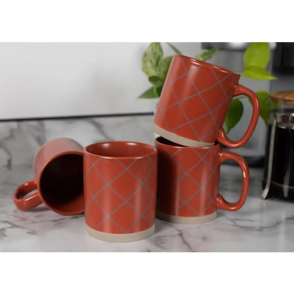 Elanze Designs Modern Plaid Raw Clay Bottom Orange 16 Ounce Ceramic Coffee Mugs Set Of 4