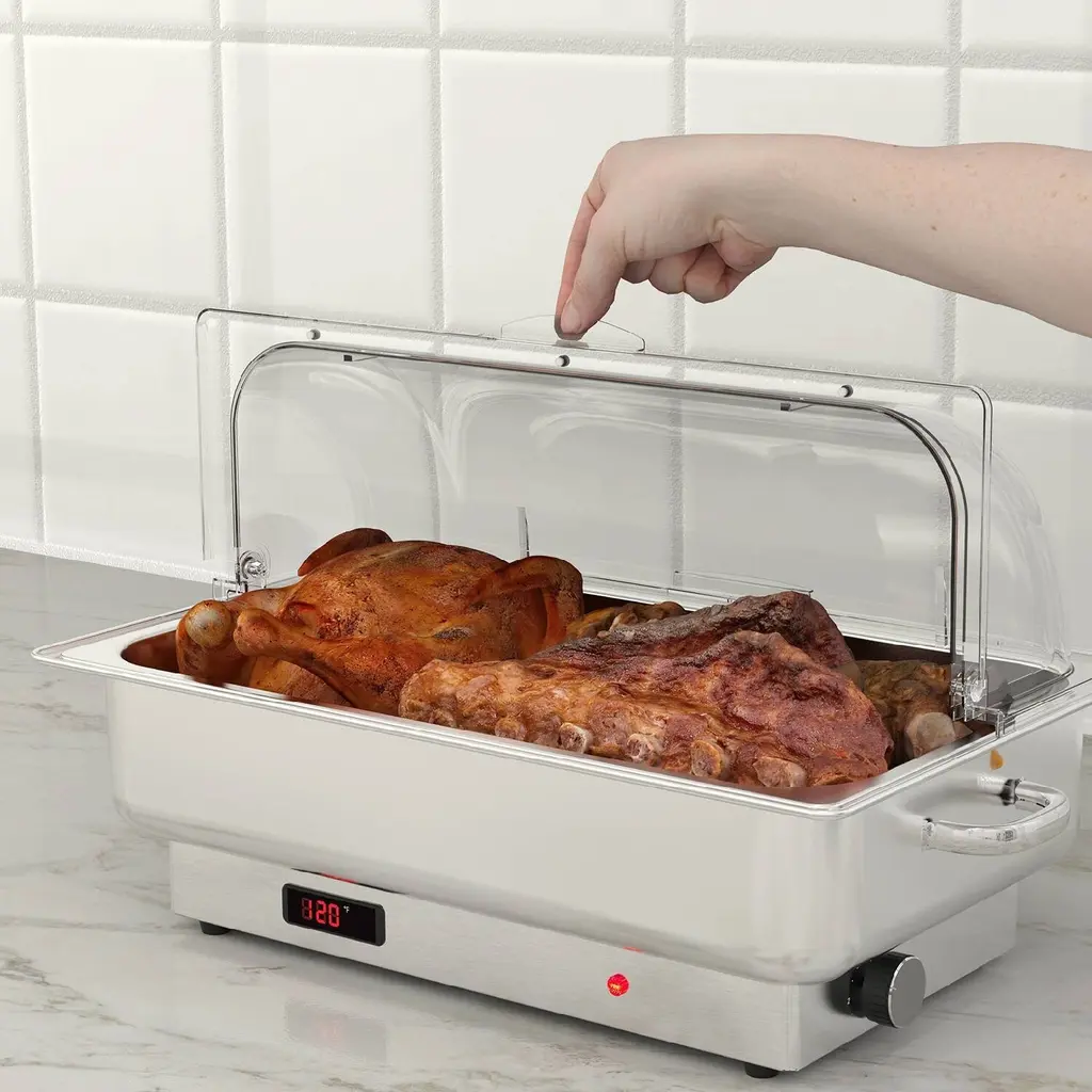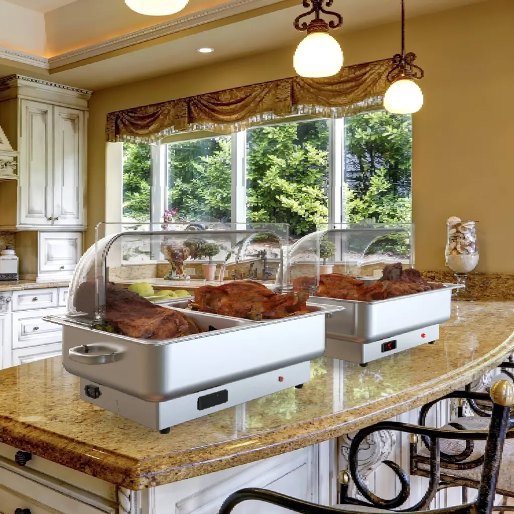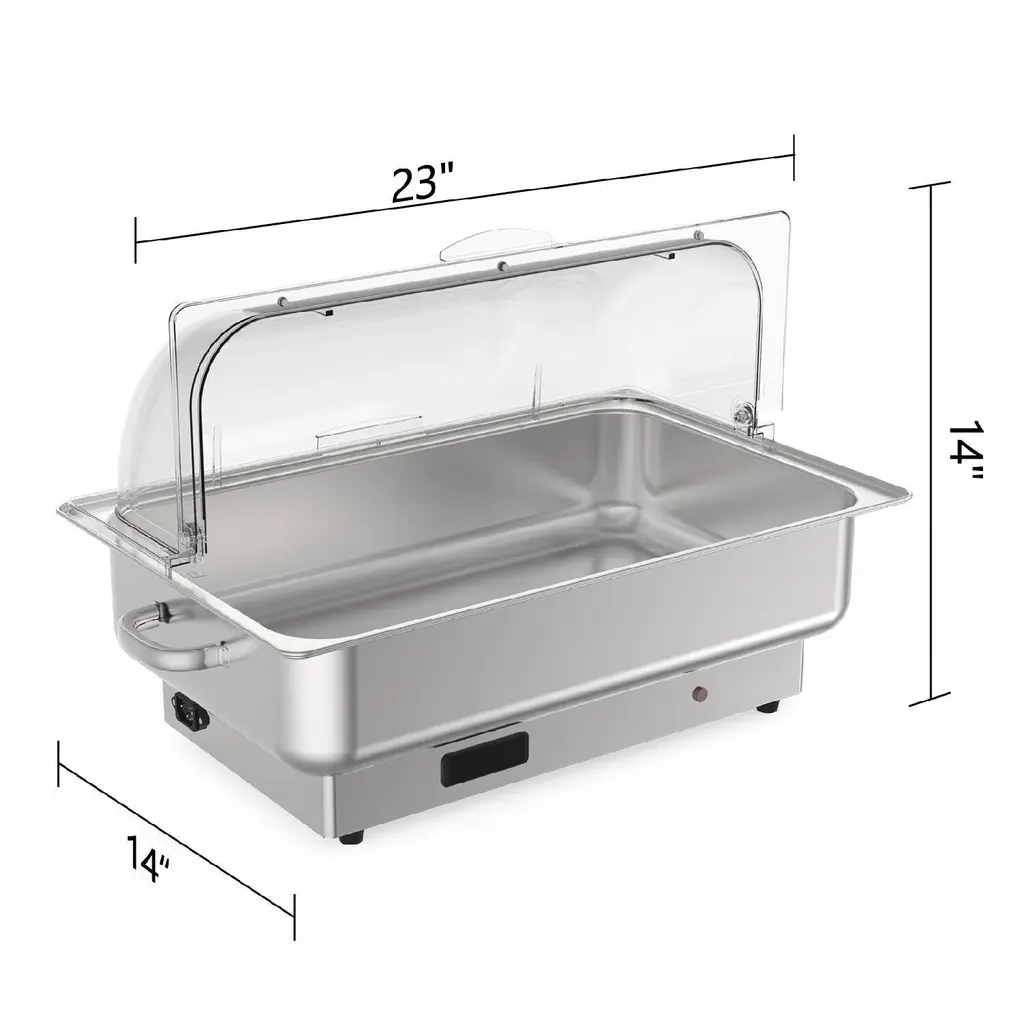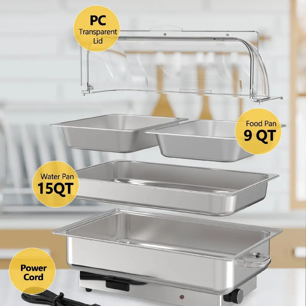 【Temperature Control & Display】Powered by a 400W built-in heating element, after fill the water pan with water, it can be easily adjust the thermostat between 86°F and 200°F(30°C and 93°C) to suit your food service requirements, low power consumption higher efficiency.【Food Grade Stainless Steel & Roll PC Lid】Warming trays for buffets party is made of food grade stainless steel with a 2 1/2 NSF-certified food pan. PC lid is made of non-toxic and environmentally friendly PC material.【Wide Application】Large capacity electric chafing dish can serve a lot of guests, it is a good choice for hosting parties and holiday dinners. Such as catering, parties, restaurants, buffets, hotels, wedding brunches. Whether your event is indoors or outdoors.