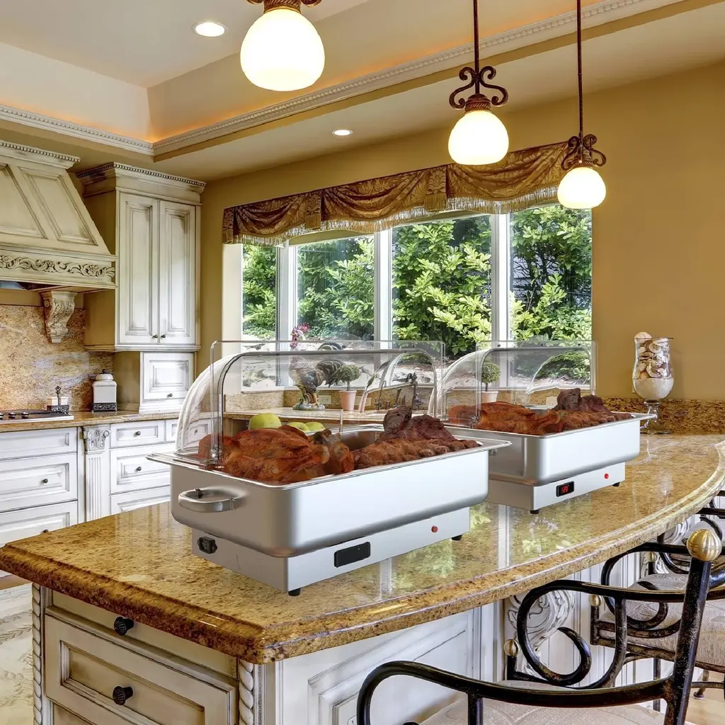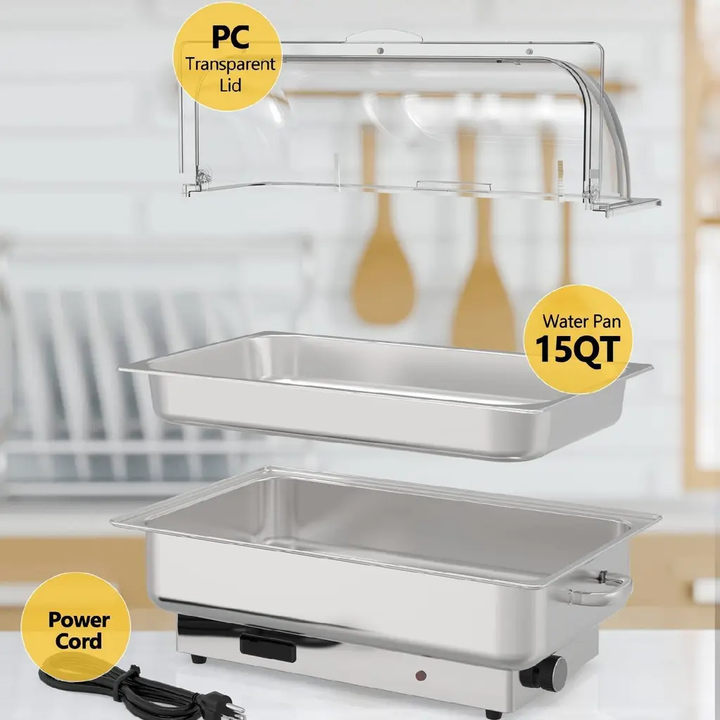 【Temperature Control & Display】Powered by a 400W built-in heating element, after fill the water pan with water, it can be easily adjust the thermostat between 86°F and 200°F(30°C and 93°C) to suit your food service requirements, low power consumption higher efficiency.【Food Grade Stainless Steel & Roll PC Lid】Warming trays for buffets party is made of food grade stainless steel with a 2 1/2 NSF-certified food pan. PC lid is made of non-toxic and environmentally friendly PC material.【Wide Application】Large capacity electric chafing dish can serve a lot of guests, it is a good choice for hosting parties and holiday dinners. Such as catering, parties, restaurants, buffets, hotels, wedding brunches. Whether your event is indoors or outdoors.