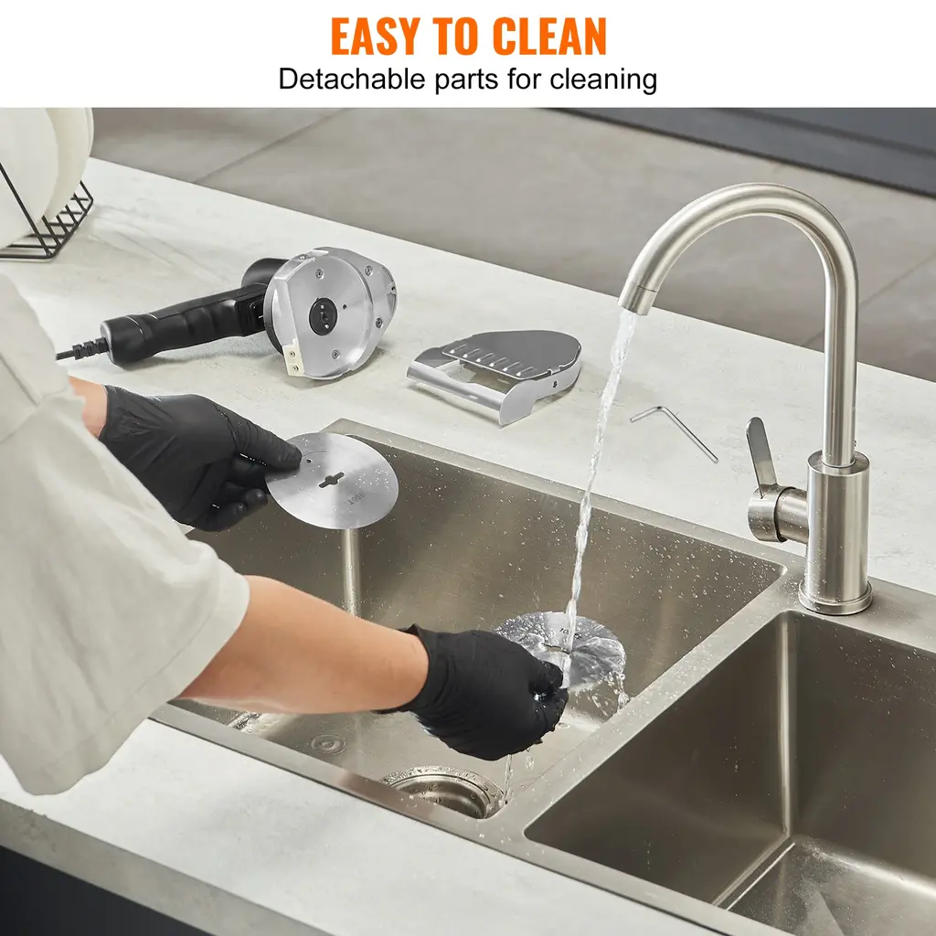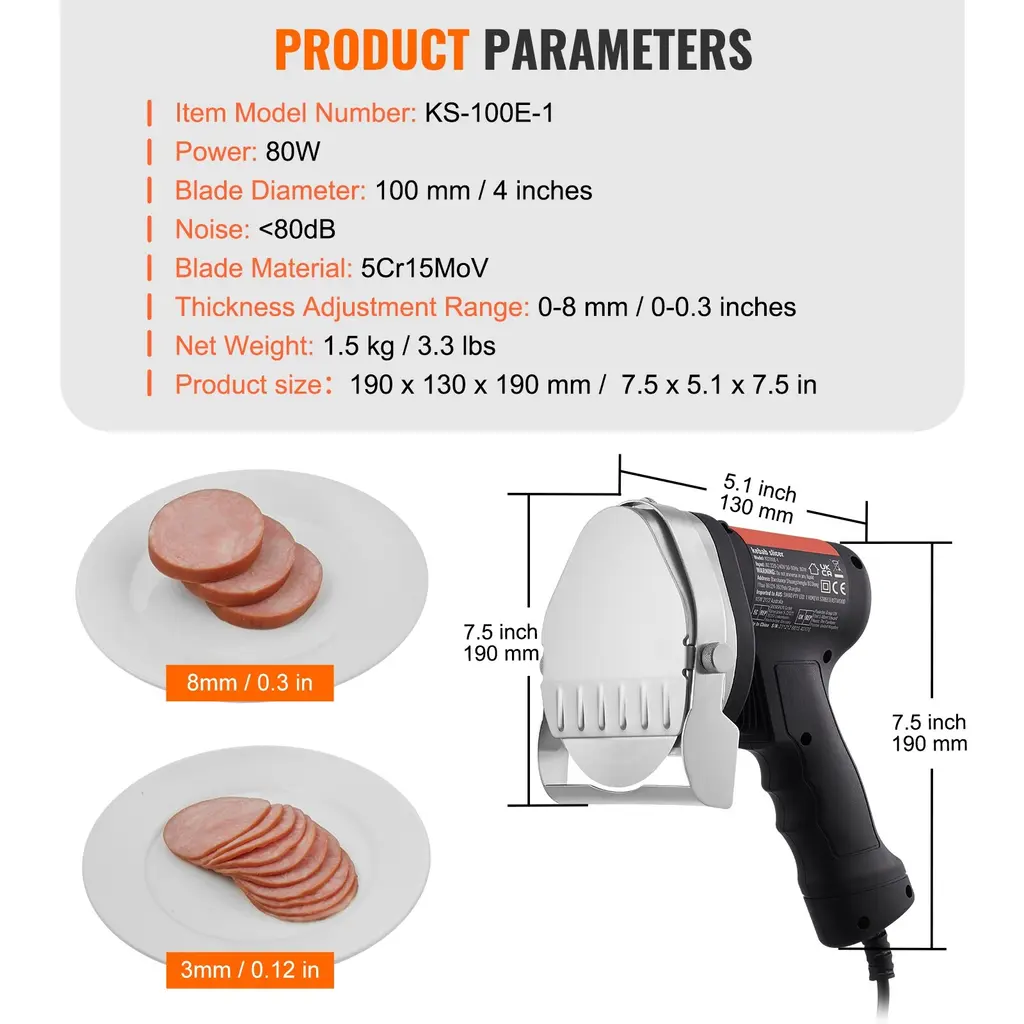 Two Types of Blades: The shawarma knife comes with two types of blades: one flat blade and one serrated blade. These are suitable for handling ingredients of different textures. You can easily remove and replace the blades using the provided hex wrench. Additionally, a sharpening stone is included. Fast Cutting: Equipped with an 80W motor, this professional turkish kebab slicer pairs with sharp blades to enable you to quickly slice barbecue. It significantly enhances your work efficiency. Adjustable Thickness: The commercial gyro cutter features a thickness adjustment knob at the top, with a range of 0-8mm / 0-0.3 in. You can adjust the size as needed, cutting barbecue to the perfect texture. Detachable: The parts that come into contact with food are made from food-grade 5Cr15MoV stainless steel, known for its wear resistance and corrosion resistance. The blades and accessories are all detachable for easy cleaning. Easy to Use: The electric shawarma kebab knife is lightweight and is equipped with an external power cord. Its ergonomically designed anti-slip handle allows for easy handling, supporting extended periods of meat cutting. Package Content 1 x Turkish Kebab Slicer 1 x Instruction Manual 1 x Serrated Blade 1 x Sharpening Stone 1 x Timing Belt 1 x Hex Wrench (2 x Batteries)