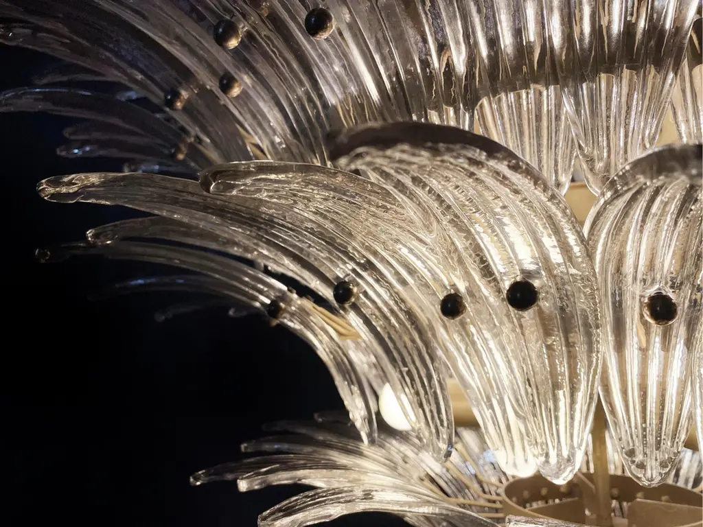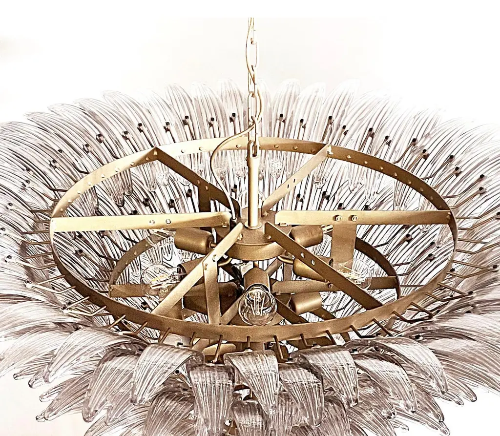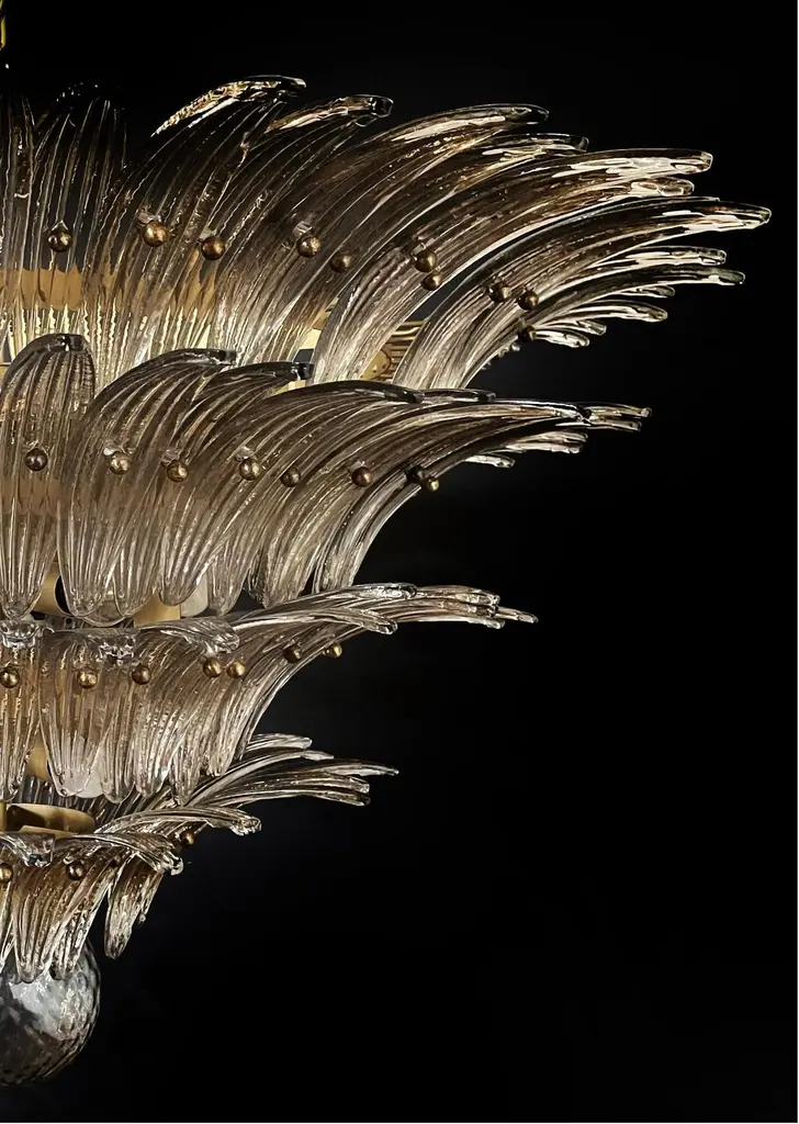 Palmette ceiling light made by 163 Murano smoked glasses in a gold metal frame. Murano blown glass in a traditional way. Structure in gold colored metal.Period: 1980sDimensions: 55,10 inches (140cm) height with chain; 31,50 inches (80 cm) height without chain; 45,30 inches (115 cm) diameter; Dimension glasses: 10,25 inches (26 cm) lenght; 2,40 inches (6 cm) width - Dimension glass balls: 7,10 inches (18 cm) diameter; Light bulbs: 18 light bulbs: E27 dimension (not included in the sale) - - On request we can replace the lampholders with those suitable for the American electrical system.Condition:perfect vintage condition and fully working; the glasses are perfect. The metal structure has some sign of opacity due to the passing of the years.