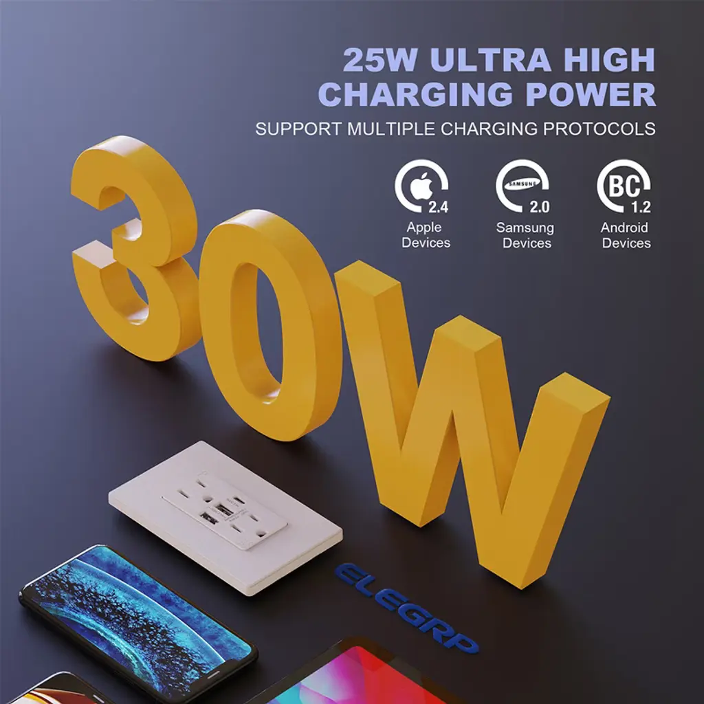Elegrp 30-watt 15 Amp 3-port Type C And Dual Type A Usb Duplex Usb Wall Outlet, Wall Plate Included, Light Almond(2-pack)