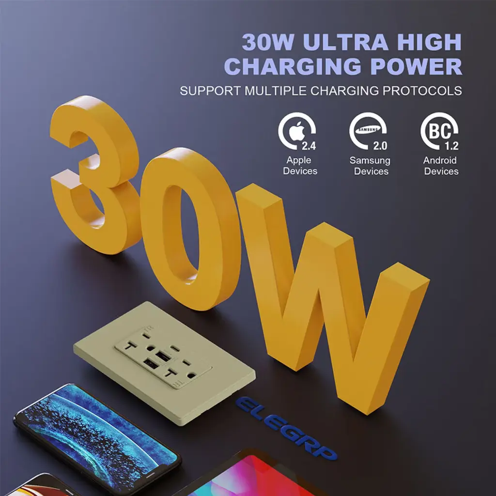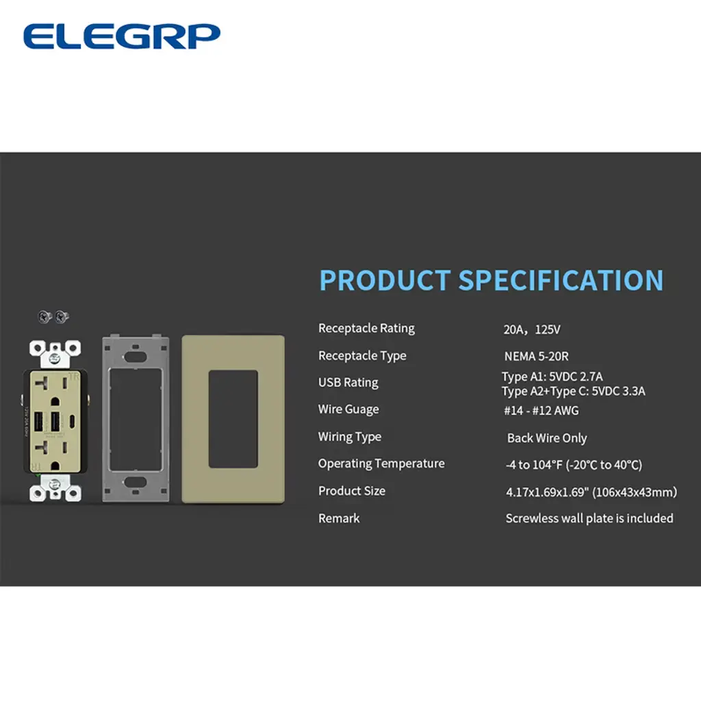 Elegrp 30-watt 3-port Type C & Dual Type A Usb Duplex Outlet Smart Chip High Speed Charging Wall Plate Included, Ivory (2-pack)