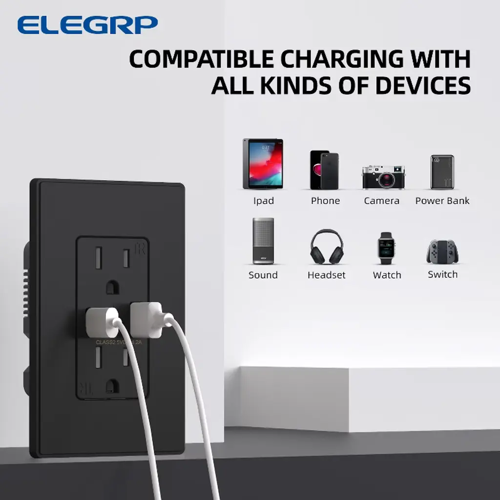 Elegrp 4.2 Amp Type A & Type C Usb Charger Wall Outlet, 15 Amp Duplex Tamper Resistant Outlet, With Wall Plate, White(10 Pack)