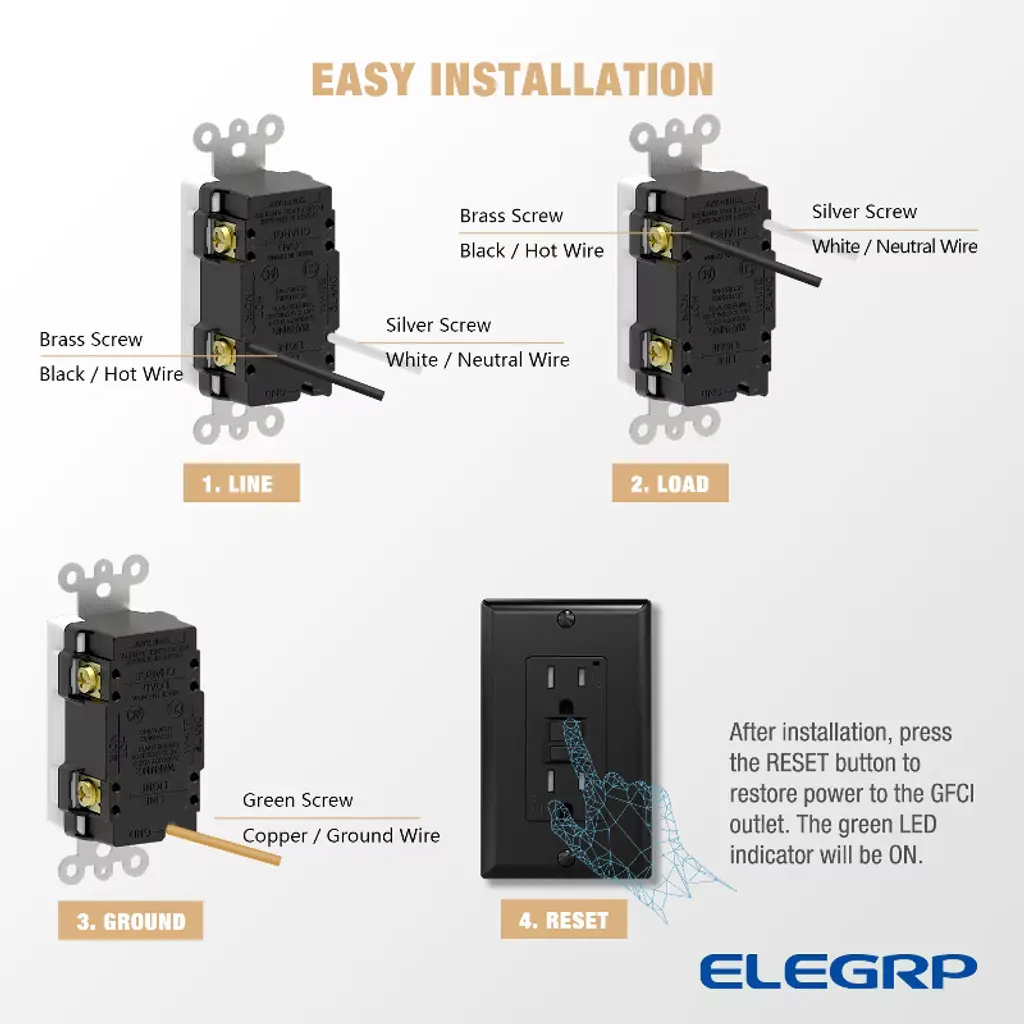 ELEGRP¡¯s ground fault circuit interrupter (GFCI) outlet provides continuous protection from ground faults during its whole life period. The GFCI receptacles conduct an auto-monitor function self-test every five seconds exceeding UL 943 requirements for a frequency of 3 hours. Ultra-compact design leaves more space for other wiring devices for easier and quicker installation in electrical boxes. Miswire protection interrupts power in an event that the GFCI receptacle is miswired by interposing line and load branch circuit supply wiring. The GFCI receptacle will deny power to receptacle face and downstream. Automatic shutter system prevents young children from inserting unwanted objects into the outlets. Our products are UL and CUL Listed, which meets UL standards.