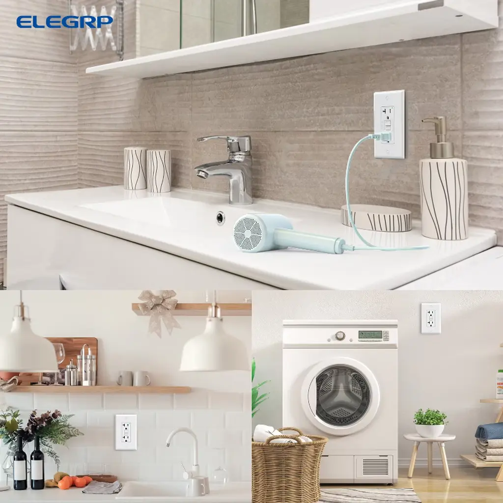 ELEGRP¡¯s ground fault circuit interrupter (GFCI) outlet provides continuous protection from ground faults during its whole life period. The GFCI receptacles conduct an auto-monitor function self-test every five seconds exceeding UL 943 requirements for a frequency of 3 hours. Ultra-compact design leaves more space for other wiring devices for easier and quicker installation in electrical boxes. Miswire protection interrupts power in an event that the GFCI receptacle is miswired by interposing line and load branch circuit supply wiring. The GFCI receptacle will deny power to receptacle face and downstream. Automatic shutter system prevents young children from inserting unwanted objects into the outlets. Our products are UL and CUL Listed, which meets UL standards.