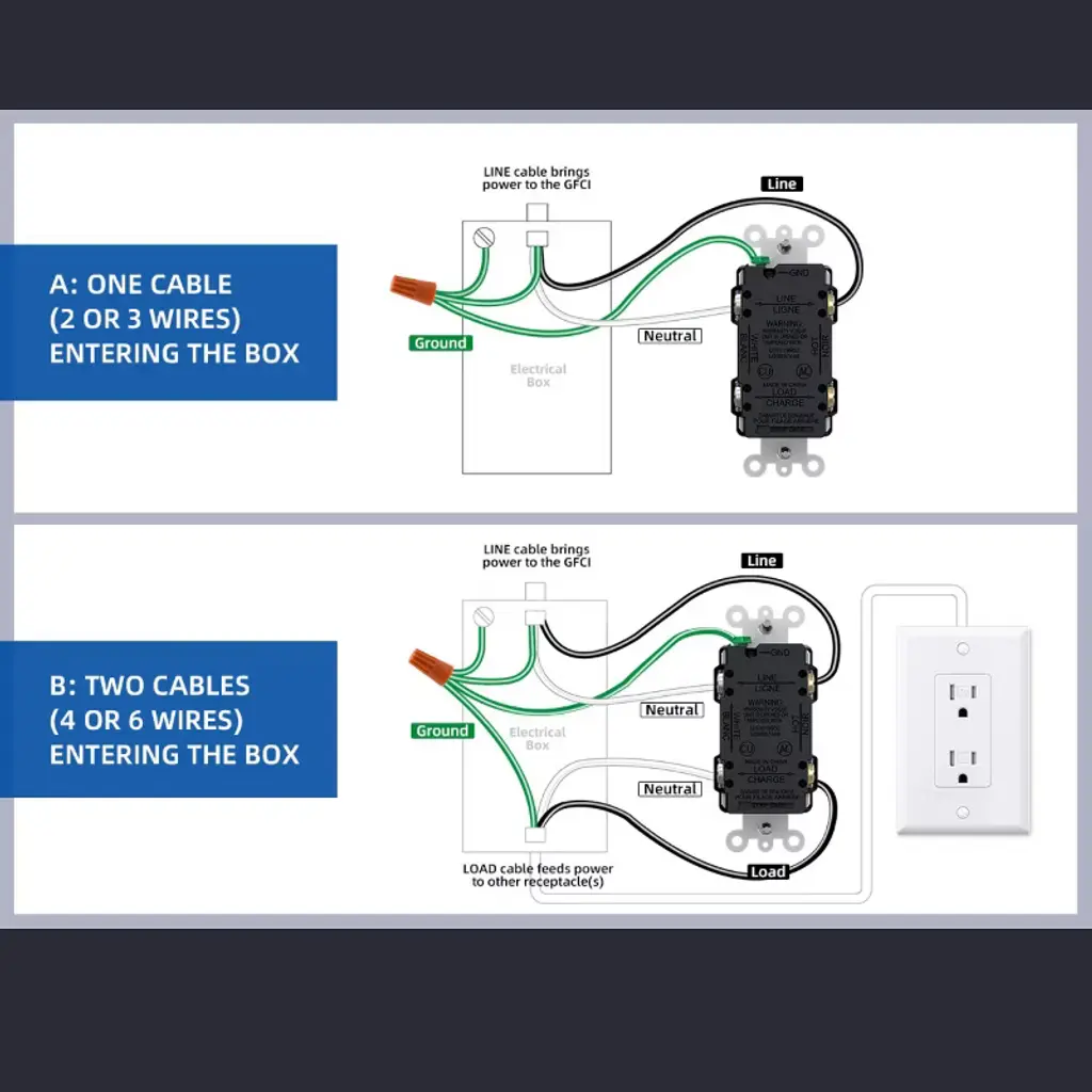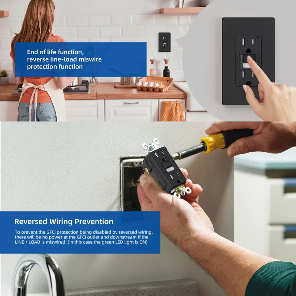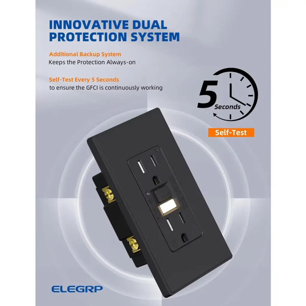 ELEGRP¡¯s ground fault circuit interrupter (GFCI) outlet provides continuous protection from ground faults during its whole life period. The GFCI receptacles conduct an auto-monitor function self-test every five seconds exceeding UL 943 requirements for a frequency of 3 hours. Ultra-compact design leaves more space for other wiring devices for easier and quicker installation in electrical boxes. Miswire protection interrupts power in an event that the GFCI receptacle is miswired by interposing line and load branch circuit supply wiring. The GFCI receptacle will deny power to receptacle face and downstream. Automatic shutter system prevents young children from inserting unwanted objects into the outlets. Our products are UL and CUL Listed, which meets UL standards.