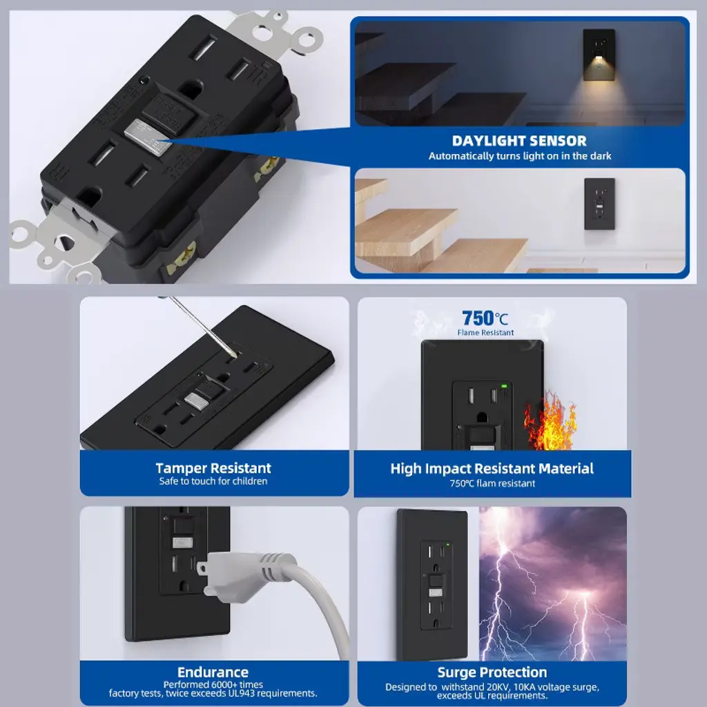 Elegrp Gfci Outlet With Night Light, 15 Amp 125v Tamper Resistant Duplex Wall Outlet, Wall Plate Included, Matte Black 1Pc