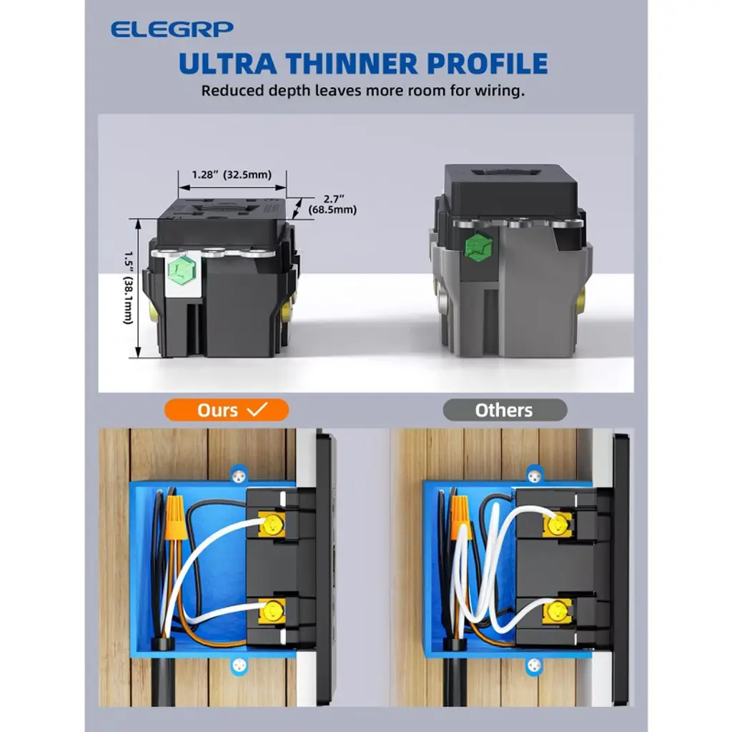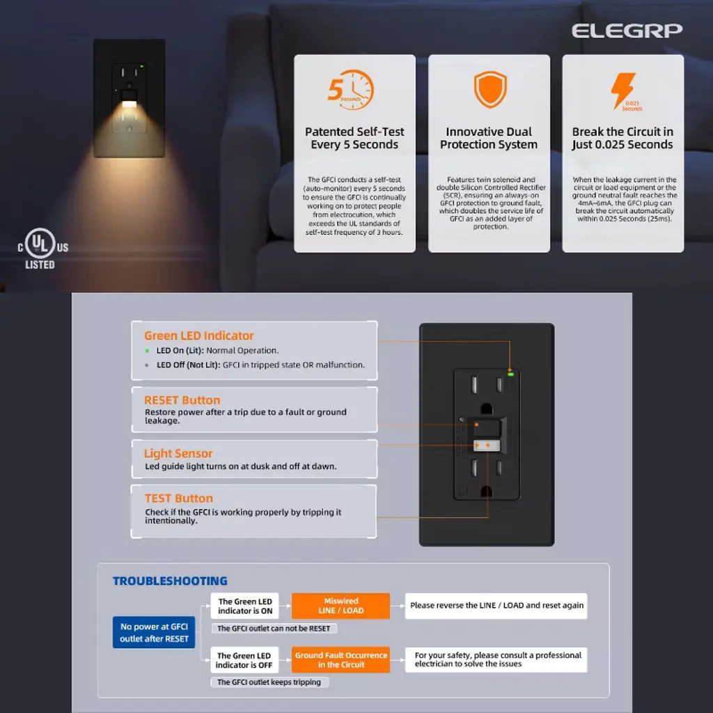ELEGRP¡¯s ground fault circuit interrupter (GFCI) outlet provides continuous protection from ground faults during its whole life period. The GFCI receptacles conduct an auto-monitor function self-test every five seconds exceeding UL 943 requirements for a frequency of 3 hours. Ultra-compact design leaves more space for other wiring devices for easier and quicker installation in electrical boxes. Miswire protection interrupts power in an event that the GFCI receptacle is miswired by interposing line and load branch circuit supply wiring. The GFCI receptacle will deny power to receptacle face and downstream. Automatic shutter system prevents young children from inserting unwanted objects into the outlets. Our products are UL and CUL Listed, which meets UL standards.