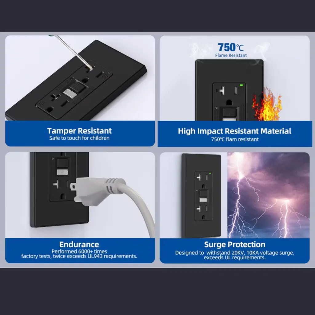 ELEGRP¡¯s ground fault circuit interrupter (GFCI) outlet provides continuous protection from ground faults during its whole life period. The GFCI receptacles conduct an auto-monitor function self-test every five seconds exceeding UL 943 requirements for a frequency of 3 hours. Ultra-compact design leaves more space for other wiring devices for easier and quicker installation in electrical boxes. Miswire protection interrupts power in an event that the GFCI receptacle is miswired by interposing line and load branch circuit supply wiring. The GFCI receptacle will deny power to receptacle face and downstream. Automatic shutter system prevents young children from inserting unwanted objects into the outlets. Our products are UL and CUL Listed, which meets UL standards.