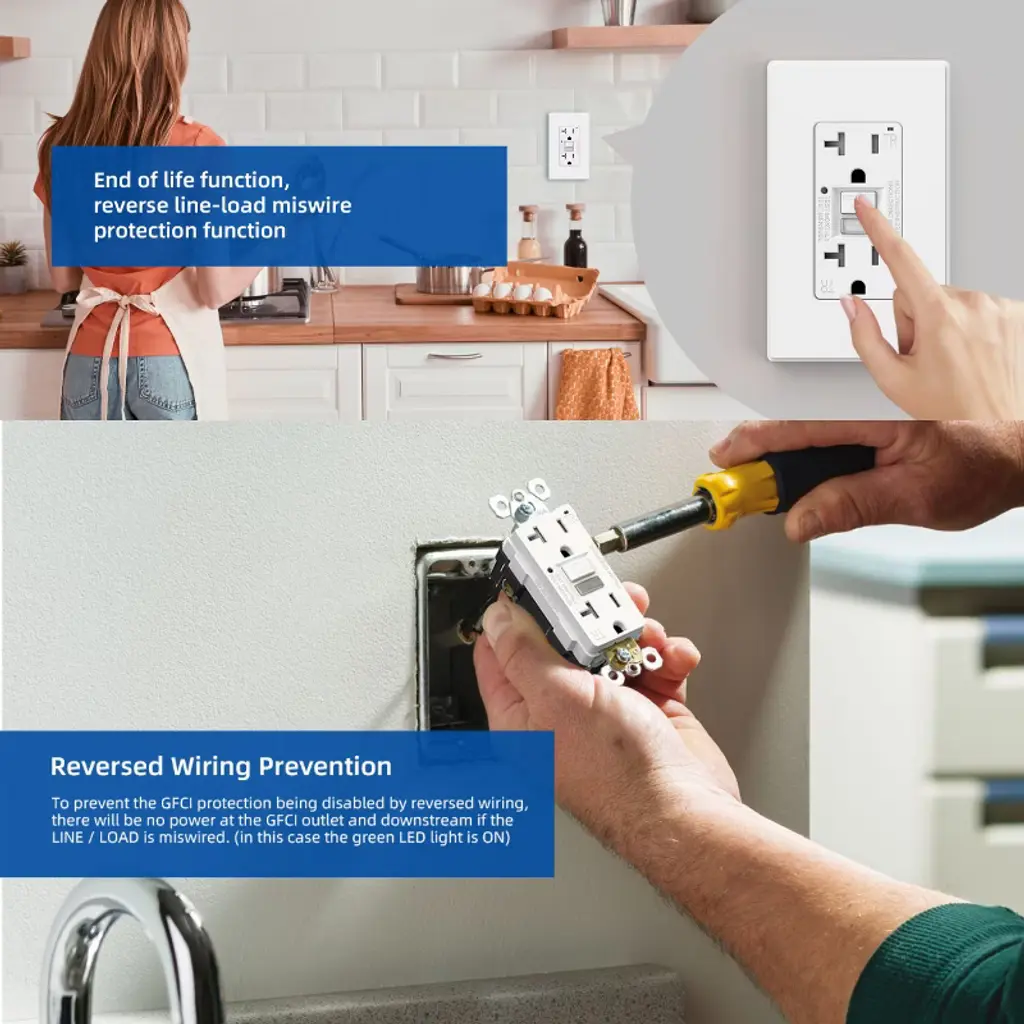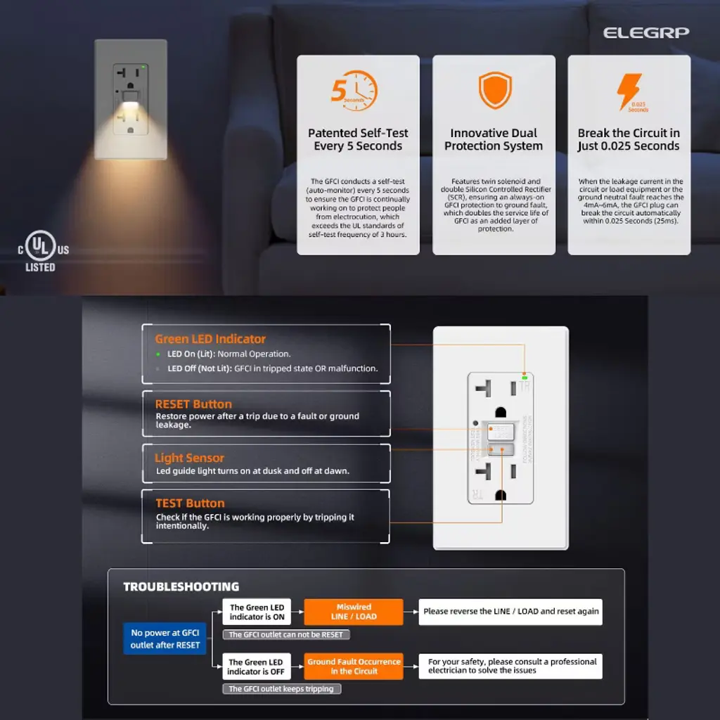 ELEGRP¡¯s ground fault circuit interrupter (GFCI) outlet provides continuous protection from ground faults during its whole life period. The GFCI receptacles conduct an auto-monitor function self-test every five seconds exceeding UL 943 requirements for a frequency of 3 hours. Ultra-compact design leaves more space for other wiring devices for easier and quicker installation in electrical boxes. Miswire protection interrupts power in an event that the GFCI receptacle is miswired by interposing line and load branch circuit supply wiring. The GFCI receptacle will deny power to receptacle face and downstream. Automatic shutter system prevents young children from inserting unwanted objects into the outlets. Our products are UL and CUL Listed, which meets UL standards.