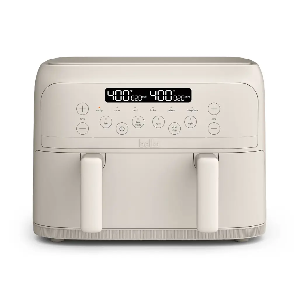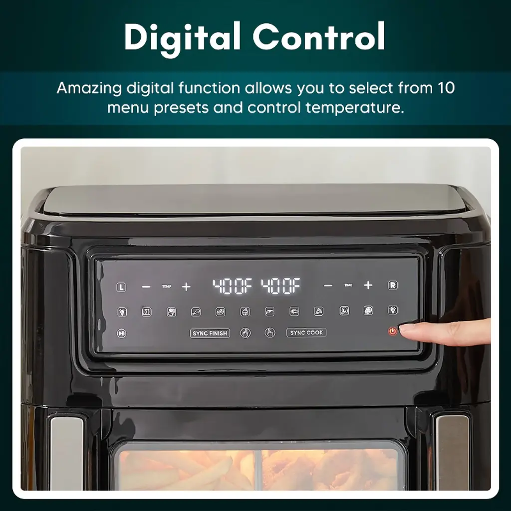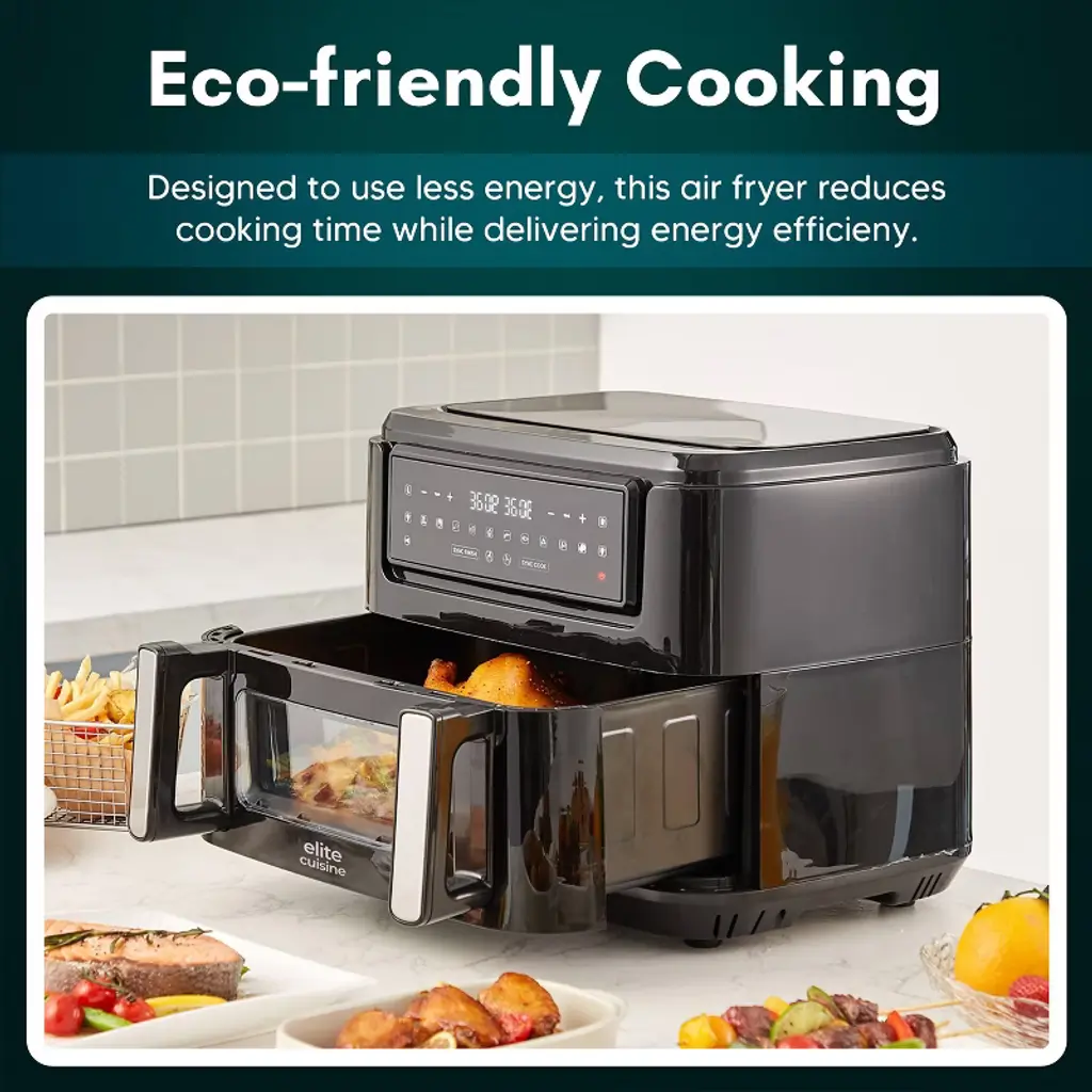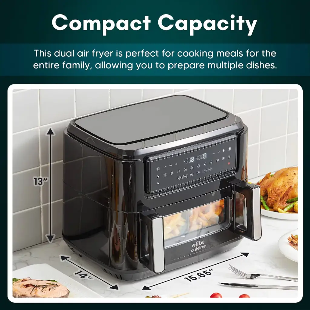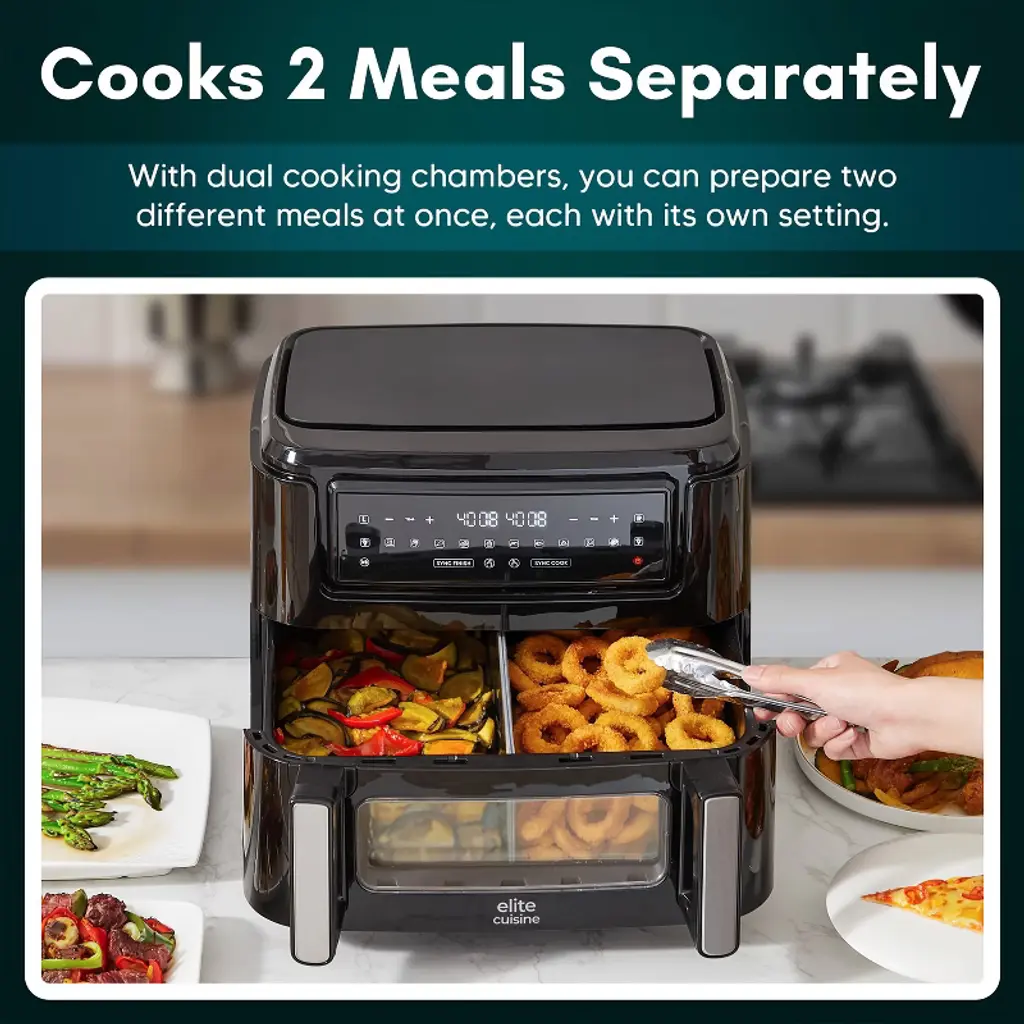 Elite Cuisine Dual Zone Air Fryer Oven, 11QT. Capacity with Divider, Sync Finish, Dishwasher Safe Basket, 10 Preset Functions, 1600-Watts, with Recipe Booklet, Black. Dual Zones & Sync Finish: Experience flexibility with Dual Zones & Sync Finish Technology, enabling you to cook two types of food with different times and temperatures, all while ensuring they finish cooking at the same time.10 Preset Functions: With adjustable time and temperature settings, this air fryer oven offers ultimate cooking control and versatility. Choose from Air Fry, Bake, Grill, Roast, Toast, Warm, and Dehydrate functions. Dual independent convection fans circulate hot air in each zone, with temperatures ranging from 160 to 400 degrees, and 60-minute timers that automatically power off each zone at the end of the cycle.