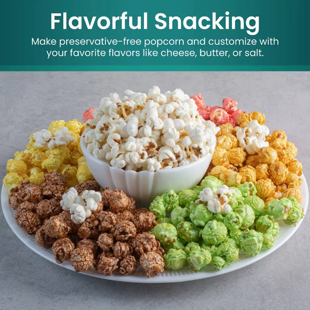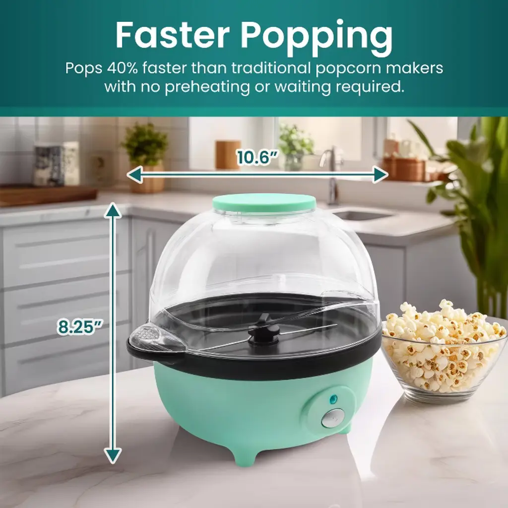 Popcorn is a delicious and healthy way to enjoy a snack at any time with family and friends. You can eat it plain for a healthier snack or indulge with butter or other seasonings. It is the perfect addition to any dinner party, backyard BBQ or movie night at home. The Elite Cuisine Hot Air Popcorn Maker uses a nonstick heating plate which increases performance and insulates the body of the popper to fully pop up to 3-quarts of popcorn in about 4 minutes. Features include the transparent cover which not only allows you to see the kernels pop, but also transforms into a family-sized serving bowl when popping is complete. When popping is complete, simply flip the machine upside down and the cover is now a serving bowl for your snack. The simple ON/OFF button of the popcorn maker activates the heating surface and rotates the stirring rods, keeping the kernels moving to pop all of the kernels and prevent burning. When finished, the non-stick heating surface is easy to clean and the dual-purpose cover and serving bowl is top-rack dishwasher safe.