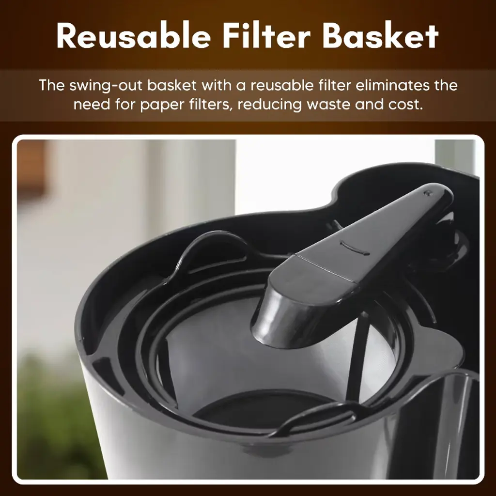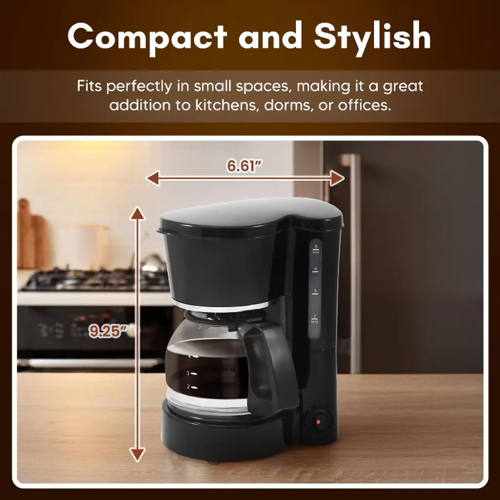 Start your day off right with the Elite Gourmet 5-Cup Coffeemaker. With its compact and sleek design that takes up limited counter space and fits into any nook. It is perfect for small spaces such as office kitchens, dorm rooms or recreational vehicles. Quickly and effortlessly brew your favorite coffee to jump start your day. No need to stop at a local coffee house to buy a cup of joe just to make it through the day. You can also use your own coffee grounds in the included reusable filter. Simply add fresh water for each brew. Cleanup is a cinch, all removable parts and accessories are dishwasher safe. Enjoy a cup of joe on the go with the Elite Gourmet 5-Cup Coffeemaker.