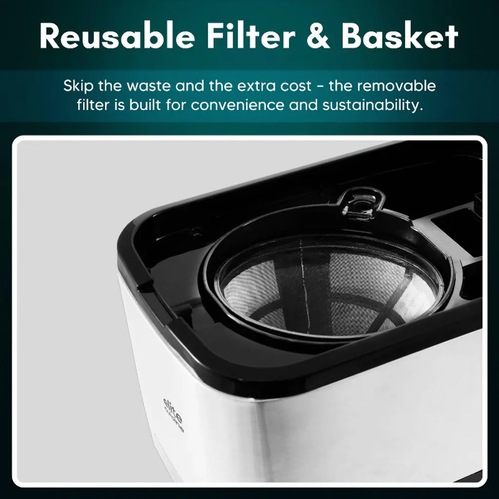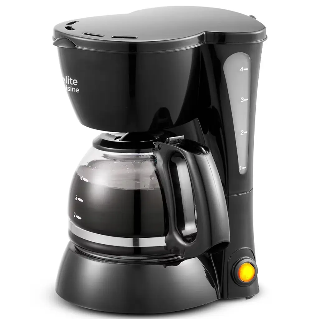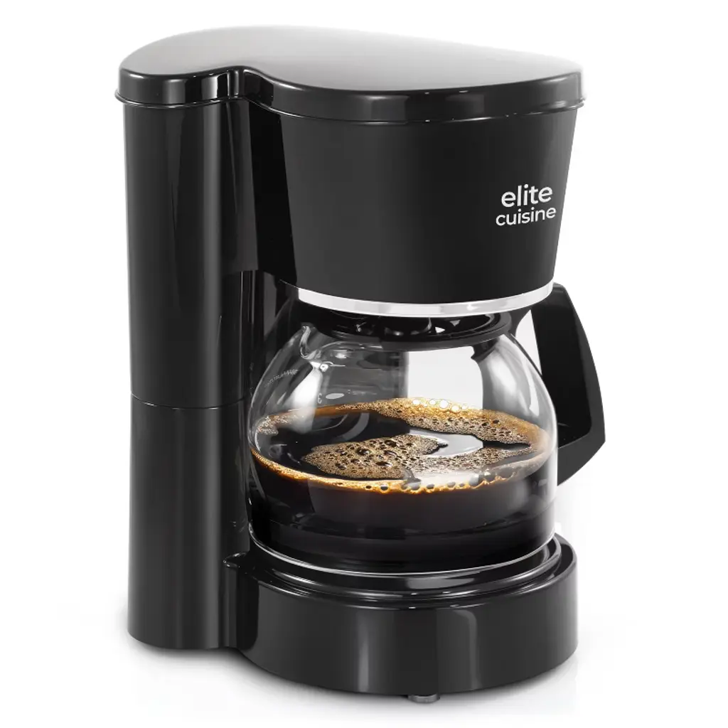 Enjoy your favorite coffee, with the Elite Cuisine 5-cup Coffeemaker. Savor delicious, fresh & hot morning coffee quick & easy. It’s ideal for apartments, office spaces, dorm rooms or a recreational vehicle. Its compact design takes up minimal counter space and is small enough to store easily. It's easy to use, simply prepare the coffeemaker, turn it On, brew. No fuss or muss. Enjoy your favorite rich-tasting coffee brewed precisely how you like it. Brew up to 5 cups of coffee using the conveniently marked carafe and water reservoir so you know how much water to add or if water is low. It features a built-in Pause ‘N Serve system that allows you to sneak a cup of coffee while still brewing. The removable, reusable and washable filter saves money and eliminates waste from disposable filters and makes clean-up a breeze. Start your day right with hot coffee ready in minutes.