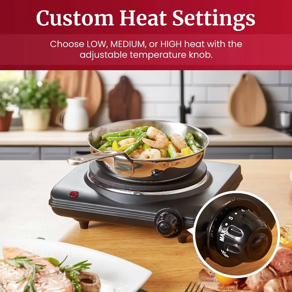 For a reliable and space-saving cooking solution, the Elite Cuisine Electric Single Buffet Burner is ideal. This portable hot plate delivers consistent heat with its 1,000-watt power and adjustable temperature knob. The non-stick cast iron hot plate ensures even cooking and simplifies cleanup. Perfect for extra cooking needs during holidays or for keeping dishes warm at buffets.