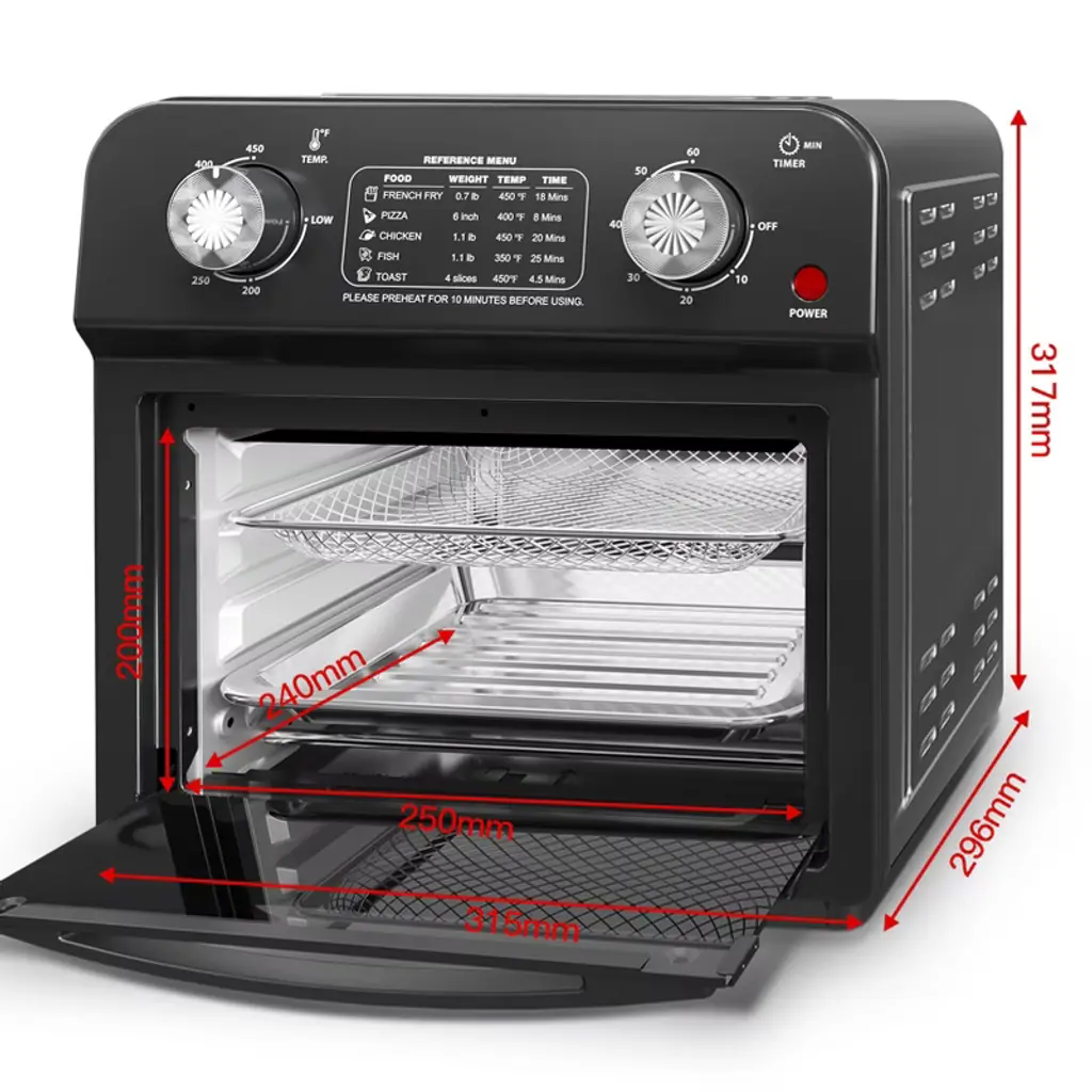 Compact design,but large capacity. 12L and 2 rack levels allow you to prepare family-size meal for up to 4-5 people at once. Applied new technology of knob control , ensuring the more precise time and temperature. ETL listed for safety, 1500W strong Power makes super Efficient to cook food in the Healthiest way by cutting over 85% of fats. Equipped with a large glass viewing window and inner oven light, make it easy to monitor cooking progress. You can make almost all food with this multi-function oven: Cake/Chicken/Fish/Pizza/Steak/Toast/Wings/Cookie/Defrost/Vegetables/French Fries/keep Warm. It comes with 3 extra accessories:1 Baking pan to bake the chicken or Steak,1 Air fryer Basket to make French fries, 1 Wire rack to make chicken wings,dried fruit or toast,1 crumb tray that catches fat and oil.Geek customer service ready to serve you within 24h.