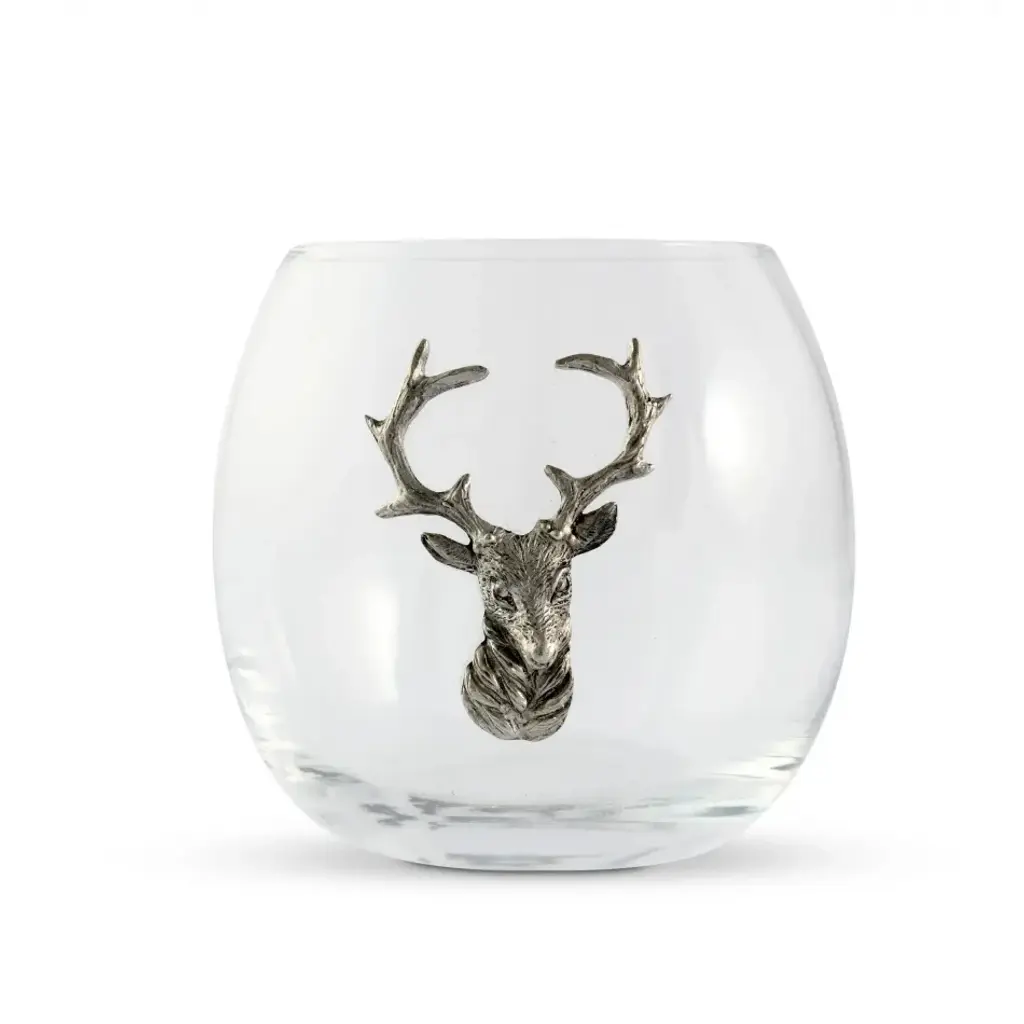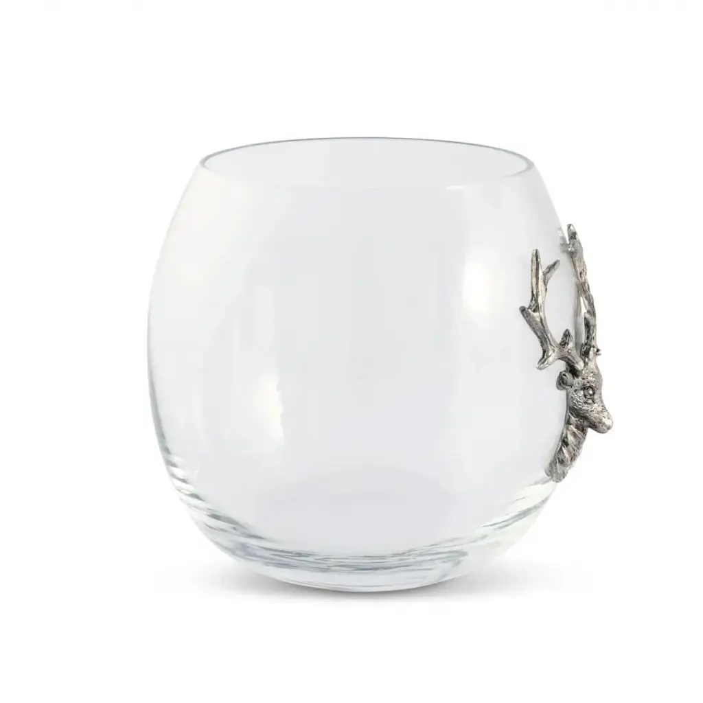 Take your tastings up a notch with this elk / deer stemless wine glass. The rounded design fits beautifully in the palm while you're sipping with friends, and the clear coloration showcases your favorite vintages as you enjoy wine and cheese pairings. Use this elk / deer stemless wine glass to update wildlife or lodge themes in your mountain cabin or country vacation home. The elegant silvertone animal sits atop the clear glass for added textural appeal and meshes well with existing cottage decor. Vagabond House is a family-owned American company specializing in fine pewter tableware, servingware and giftware. Largely inspired by nature, their exclusive products are designed to be unique, functional heirlooms for those who seek to express tradition and style in both family and formal entertaining.