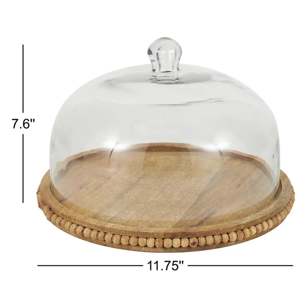 Showcase and serve cakes, pastries, and other desserts atop a doily, under this glass dome. This item ships in 1 carton. Please note that this item is for decorative purposes only and is not food safe. Mango wood cake stand makes a great gift for any occasion. Suitable for indoor use only. This item ships fully assembled in one piece. Made in india. This is a single brown colored cake plate. Farmhouse style.
