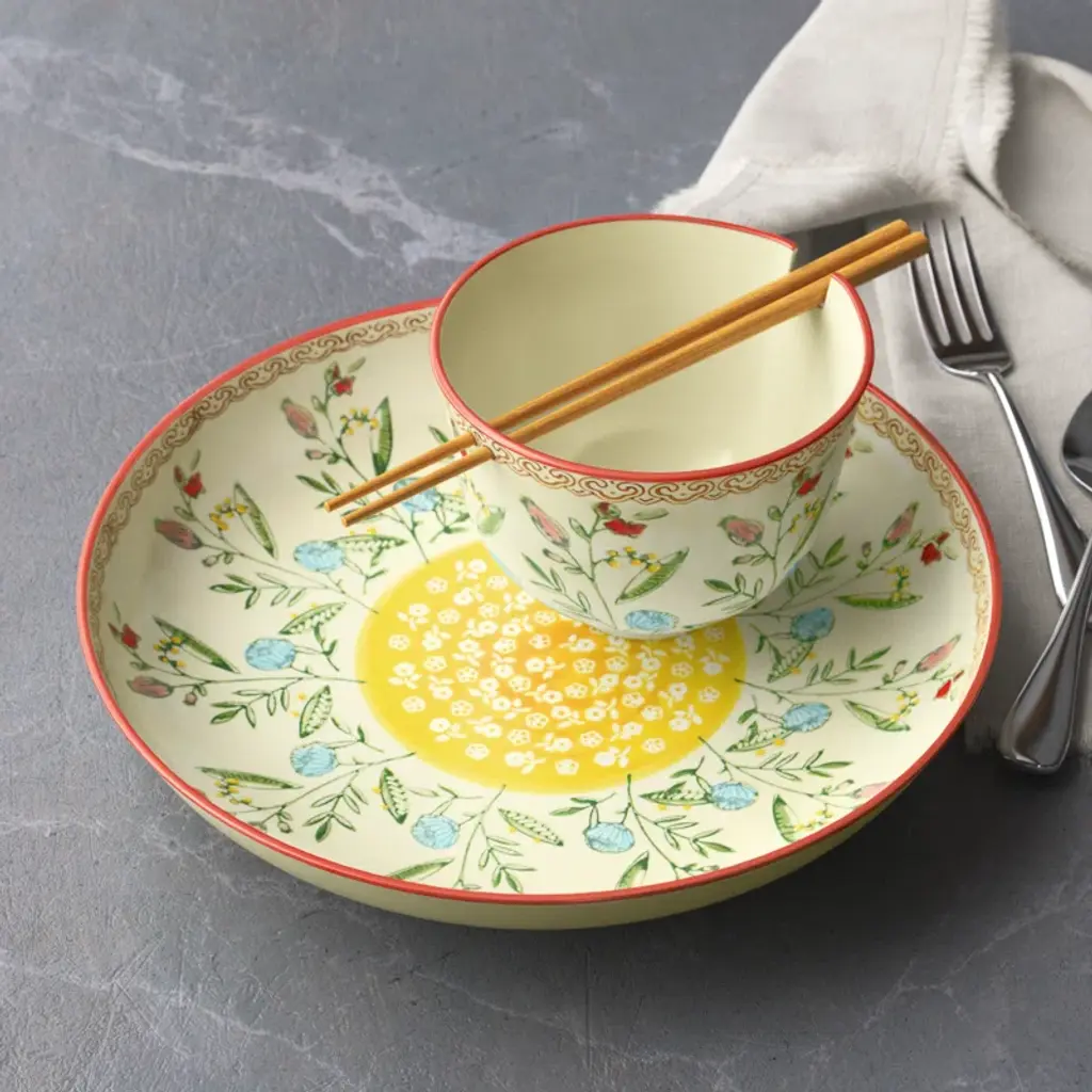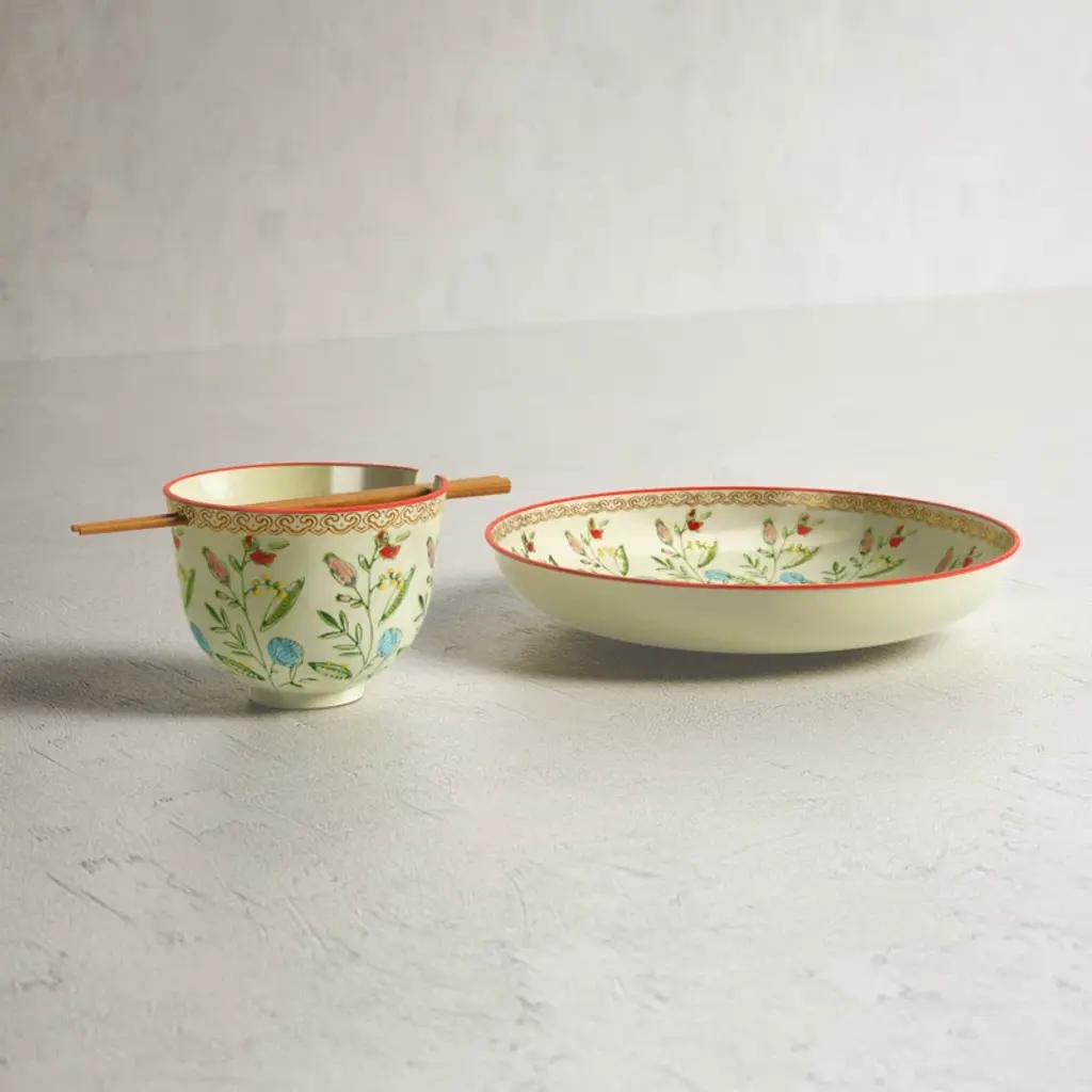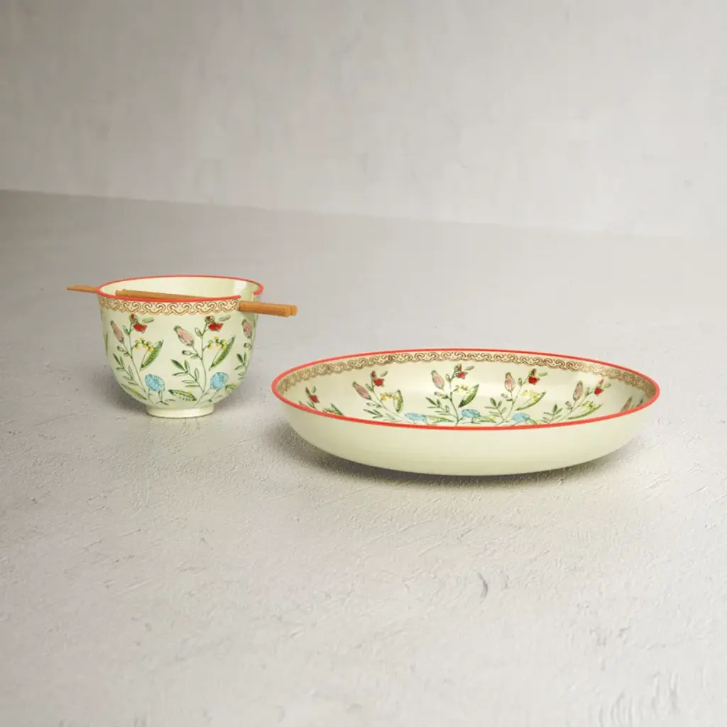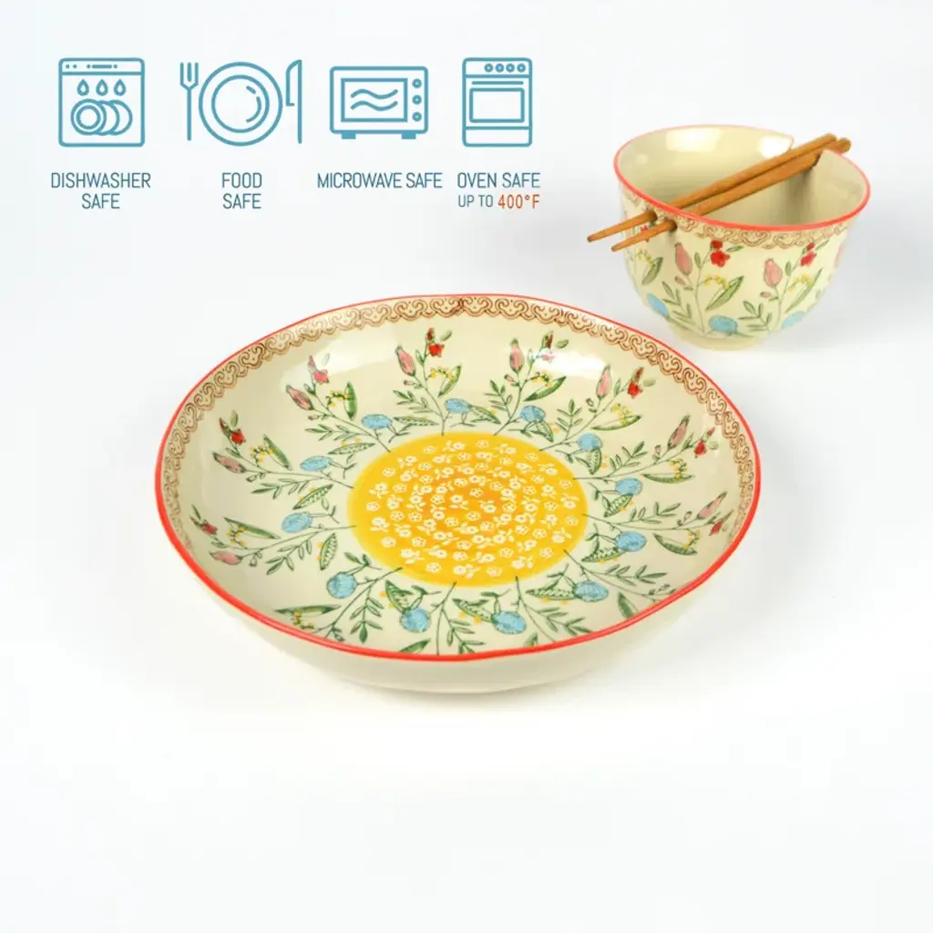 The Ella ramen and dinner bowl set is both beautiful and perfectly practical. The lovely floral designs of the Ella collection are reminiscent of the traditional block-printed sanganer patterns of Indian textiles. Each bowl shape has a unique design and is hand painted and finished by trained artisans. The taller ramen bowl is great for noodle and rice dishes, or even for cereal and comes with a pair of reusable wooden chopsticks and is designed with a chopstick rest at the top. The large bowl is ideal for dinner-sized meals, soups, and stews or also for serving.