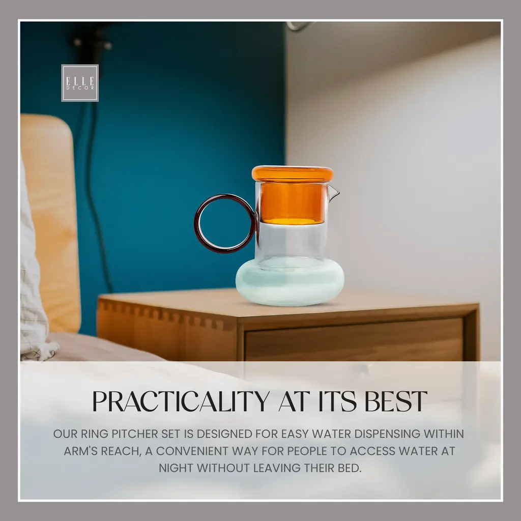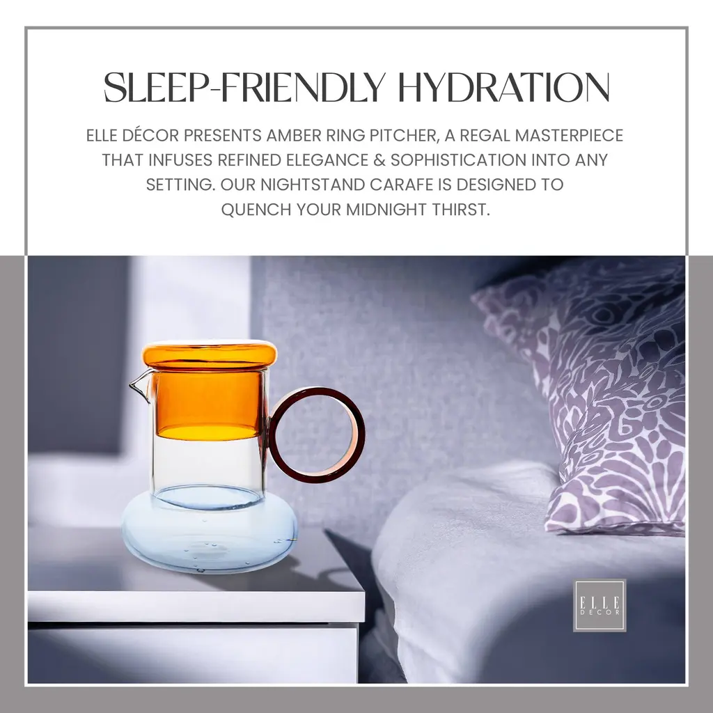Elle Decor Amber Ring Pitcher Set Carafe and Water Drinking Glass Lid 2Pc SetEnhance your bedside experience with the elle decor Amber Ring Pitcher Set. This convenient 2-piece, perfect for keeping hydrated throughout the night or as a stylish addition to your home or office décor. The carafe features an anti-drip design, ensuring that you can pour water smoothly without any accidental spills or messes. Made of durable borosilicate glass, this set is designed to be long-lasting and resistant to breakage. Its large capacity allows you to hold an ample amount of water or other beverages. The elegant Amber Ring design adds a touch of sophistication to any bedside table, bedroom, or bathroom. Additionally, the clear glass design makes it easy to monitor your water intake or medication levels. Whether you use it for practical purposes or as a decorative piece, this elle decor Amber Ring Pitcher Set is a must-have item. Order now and enjoy a convenient and stylish way to keep water close by while you sleep. FEATURES:COLOR:Clear with Amber RingMATERIAL:GlassCAPACITY:23 OuncesWHAT'S IN THE BOX:(1) Pieces Elle decor Amber Ring Pitcher Set, Carafe and Water Drinking Glass 2Pc