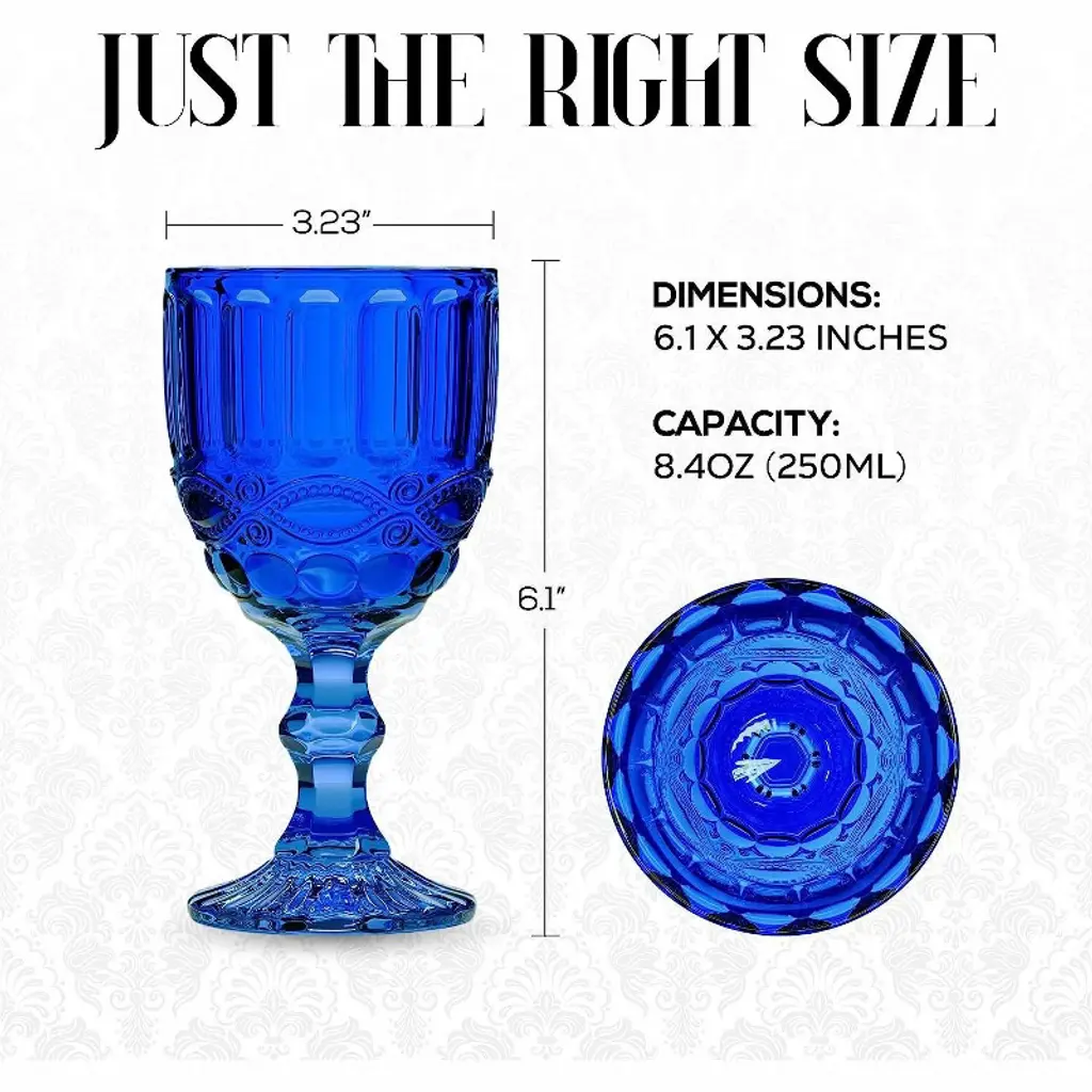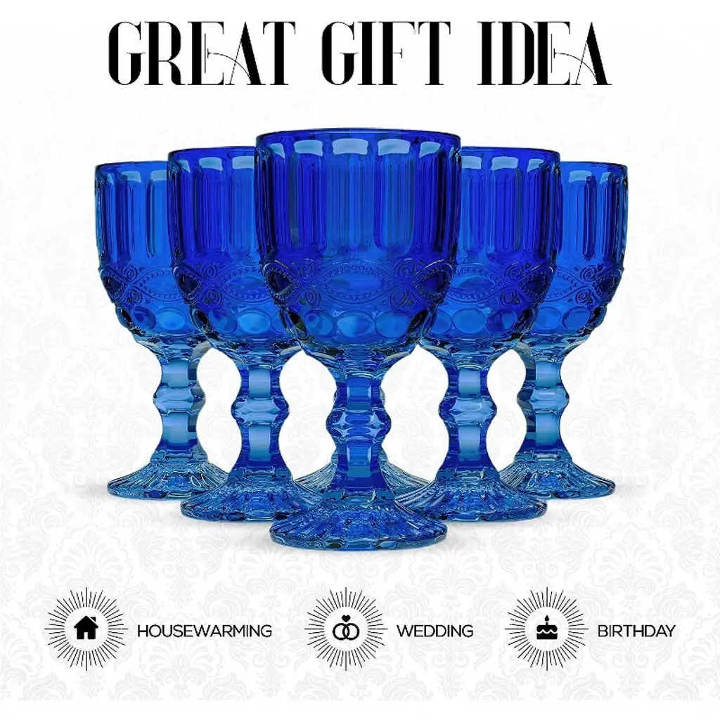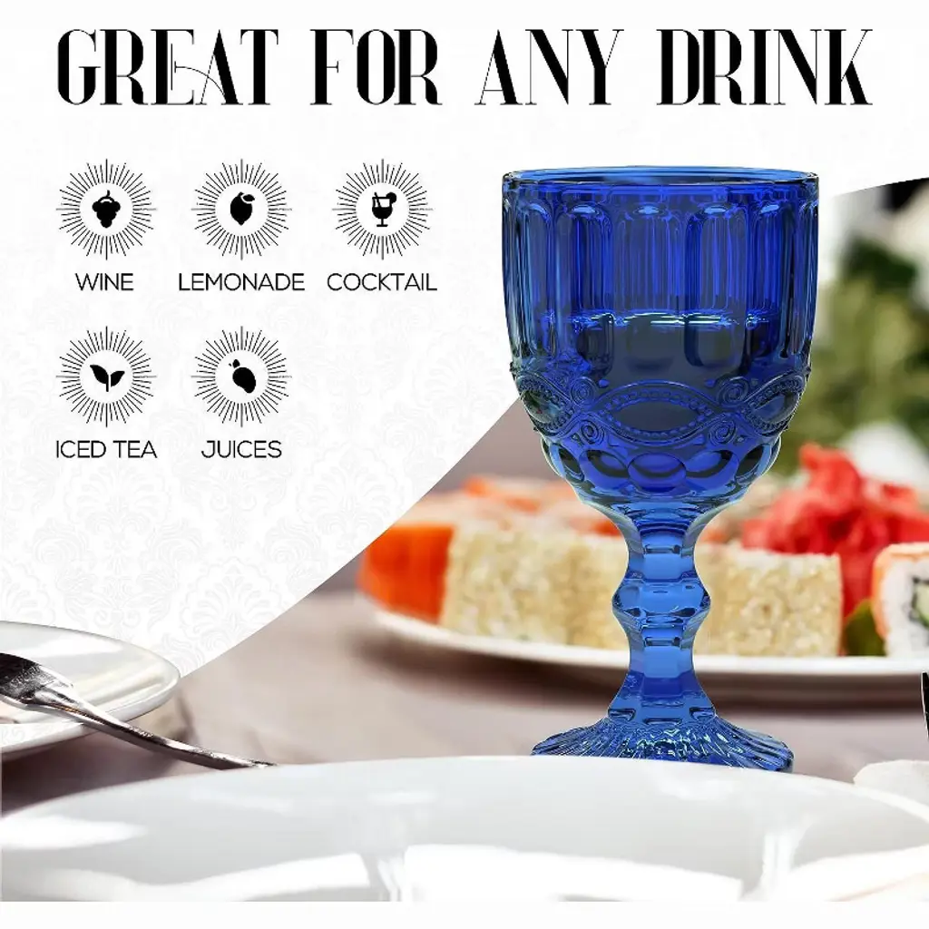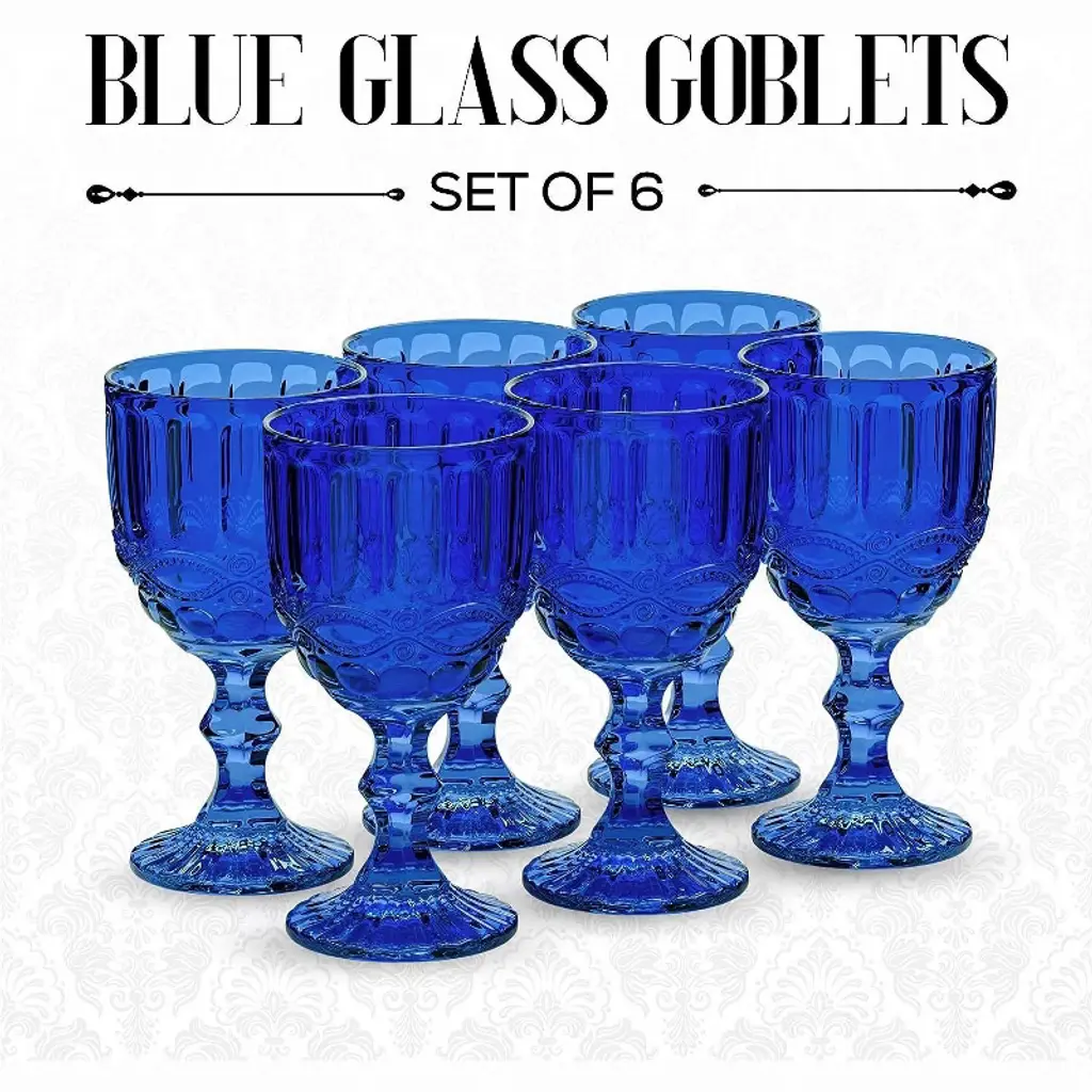 Celebrate style and elevate every sip with the Elle Decor Blue Glass Goblets, a set of 6 vintage-style wineglasses that bring warmth and vibrancy to your drinkware collection. Their radiant blue tone and intricate texture catch the light beautifully, offering a refreshing alternative to clear glassware. Whether you're hosting dinner or relaxing on a summer evening, these goblets make every moment feel special. Each goblet holds 8.4oz, making them ideal for reds, whites, and other favorite beverages like iced tea, mocktails, or cocktails. Designed with both beauty and safety in mind, they’re made from lead free, BPA free glass for a clean and conscious drinking experience. With their wide bowl and sturdy base, these elegant wineglasses are a standout choice for dining tables, drink carts, or summer soirées. The blue hue adds personality and warmth, while the vintage-inspired design blends seamlessly into both modern and eclectic décor. Whether you're upgrading your own tableware or gifting a friend, this blue goblet set offers style, comfort, and versatility with every pour.