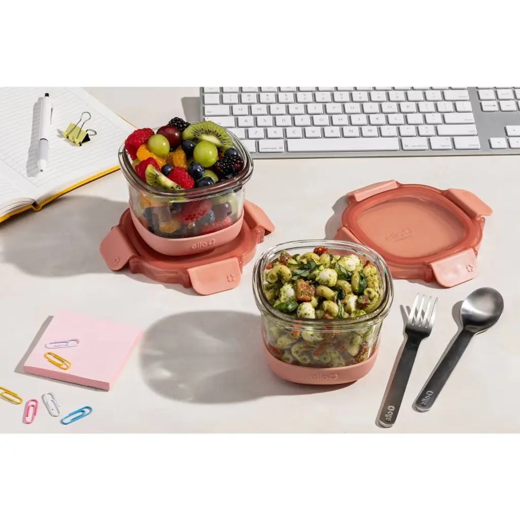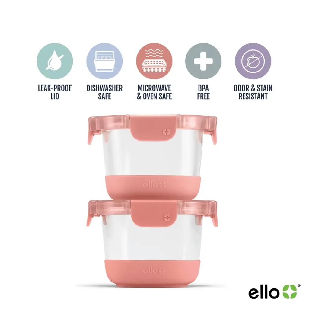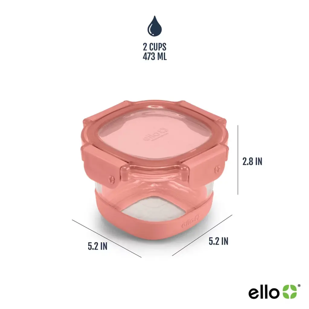 Make meal prep fun with the Ello Duraglass Refresh 8-piece 2 cup Reusable Glass Container Set! This set includes four 2-cup (16oz) containers, perfect for overnight oats, yogurt, small snacks, and leftovers. The BPA-free plastic lids have airtight snaps to prevent leaks and keep your food fresher for longer. These containers are dishwasher , microwave, and oven safe without the lid. There's no need to remove the silicone sleeve! DuraGlass is non-porous, so it won't absorb food odors, flavors, or stains. Please remember to let containers cool before placing them on wet or cold surfaces.