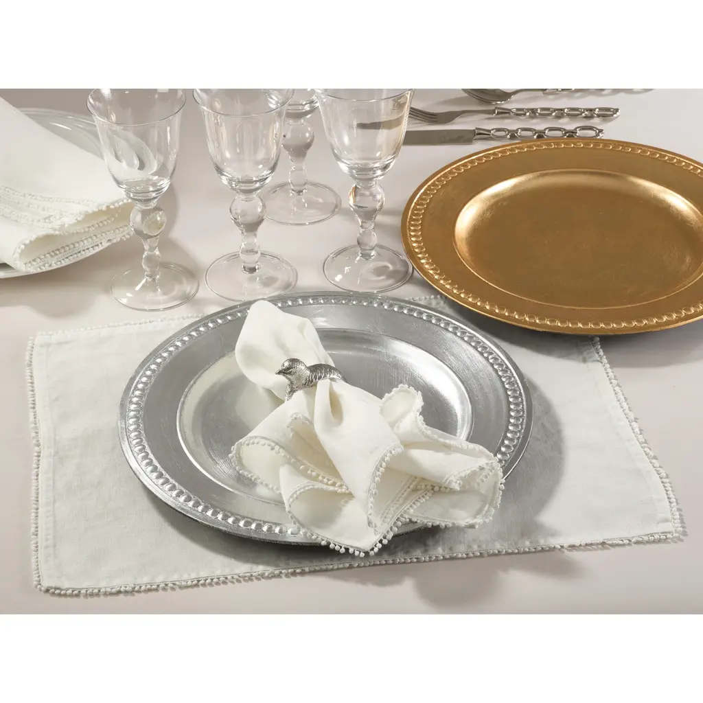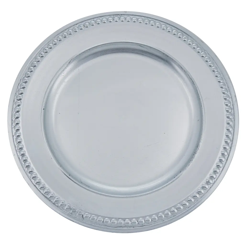 Dress up your dining table in understated elegance and create a beautiful atmosphere for your guests by adding these metallic charger plates under your dinnerware. The classic design features an embossed beaded dot along the outer edge. Colors available: Features: