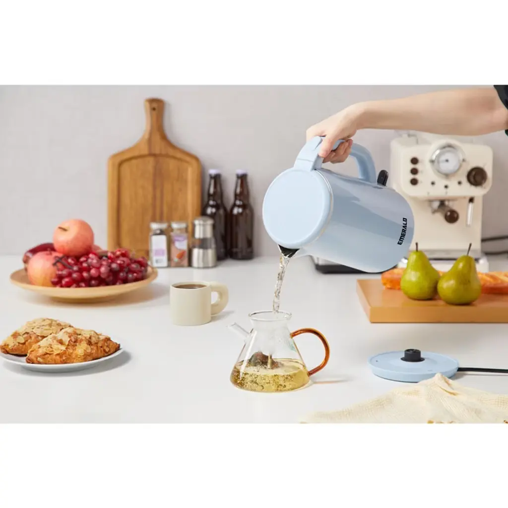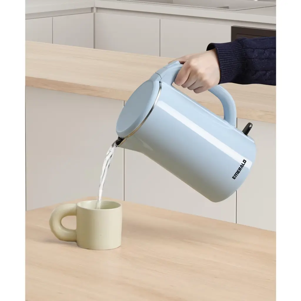 Boil water quickly, safely, and in style with Emerald's 1.8L Electric Kettle. Designed with a durable 304 stainless steel interior, this kettle ensures clean, rust resistant performance with every use. The sleek blue exterior is made from a PP insulated shell that helps retain heat while preventing accidental burns. With a powerful 13A double metal controller and waterproof design, the kettle delivers consistent performance and long lasting durability. Built in auto shut-off and boil dry protection ensure safe operation, while the stay cool handle makes for comfortable, burn free pouring. The 360° cordless rotating base allows for easy use from any direction, ideal for both left and right handed users. Whether you're brewing tea or coffee, preparing instant noodles or oatmeal, warming baby bottles, or simply speeding up your cooking routine, Emerald's Electric Kettle is a convenient and essential addition to any home, office, dorm room, or travel setup.