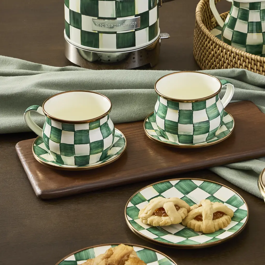 Our Emerald Check Espresso Cup & Saucer Set is the perfect way to sit back and savor an espresso. Pair it with a gourmet roast for a gift to energize a night owl's morning routine. The comfort food of kitchenware, our most popular pattern is casual and cozy, with a vibrant botanical palette woven through the glossy, hand-painted, high-contrast checks. Set of two espresso cups and two saucers.