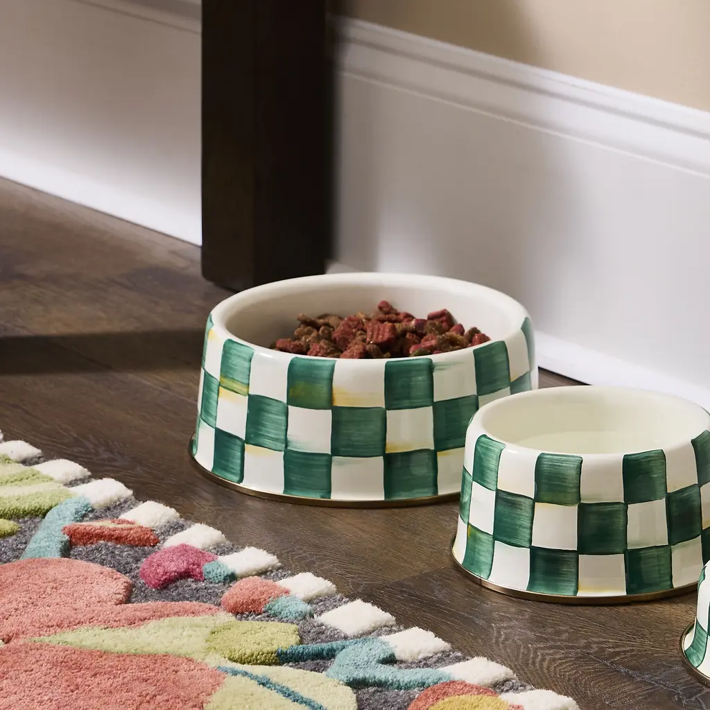 This season, it's all about checks for Spot! For your furry friends, choose the Emerald Check Large Pet Dish. The heavy-gauge steel underbody is strong enough to withstand the mealtime antics of the hungriest hounds, and hand-painted Emerald Checks are fashionable enough for the choosiest canines. With its verdant hues and painterly touch, we've yet to find a pet that doesn't look good with Emerald Check.
