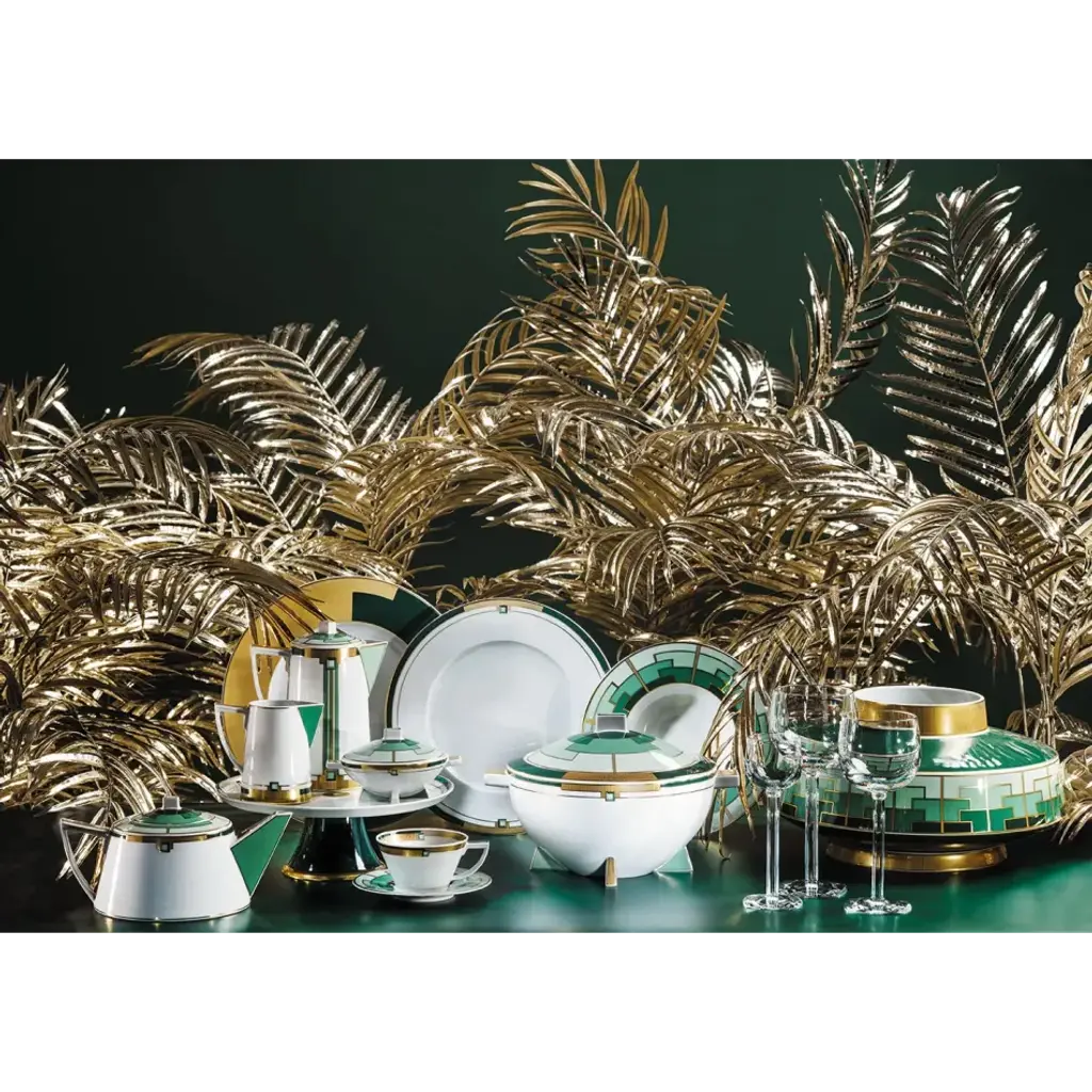 In the golden era of the Art Deco movement, metals and precious stones were elements usually associated with the geometrization of the patterns, reflecting opulence inherent in artistic creation. The pieces in the Emerald dinner set, richly decorated with matte gold and dark greens, replace excess with elegance, recreating with modernity - using original pieces of the brand from the 30s - the typical exuberance of the period. Vista Alegre is a world-renowned tabletop company and manufacturer of the largest collection of fine tableware, home decor, giftware, and hotelware in porcelain, crystal and glass in Europe. Known for its strong connection to design and culture and its tradition of working with world-renowned artists such as Christian Lacroix, Oscar de la Renta, and Karim Rashid, Vista Alegre offers a quality of excellence that appeals to a broad range of consumer tastes.
