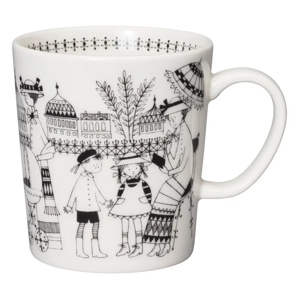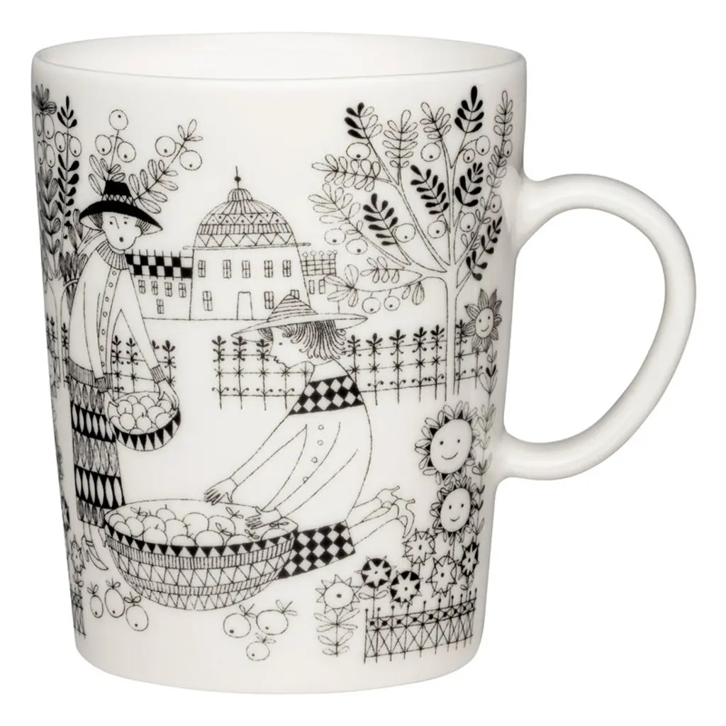 Arabia’s Emilia mug is adorned with a delightful decoration designed by Raija Uosikkinen. She originally created the enchanting Emilia decoration in 1957, and the series was in Arabia's production until the year 1966. Emilia brought a fascinating contrast to the sleek and simple designs of the 1950s, as it was decorated with vines and beautiful details, yet tamed by its black-and-white coloring. Arabia re-launched the enchanting Emilia decoration in 2023. The story goes that the Emilia motifs were inspired by the designer's own Aunt Selma, who lived a relaxed life in America. Elegantly dressed characters spend sunny days in the garden, on a picnic and lying in a hammock. Each part of the Emilia tableware conveys a fabulous breeze of holiday spirit and the leisurely feel of days off.