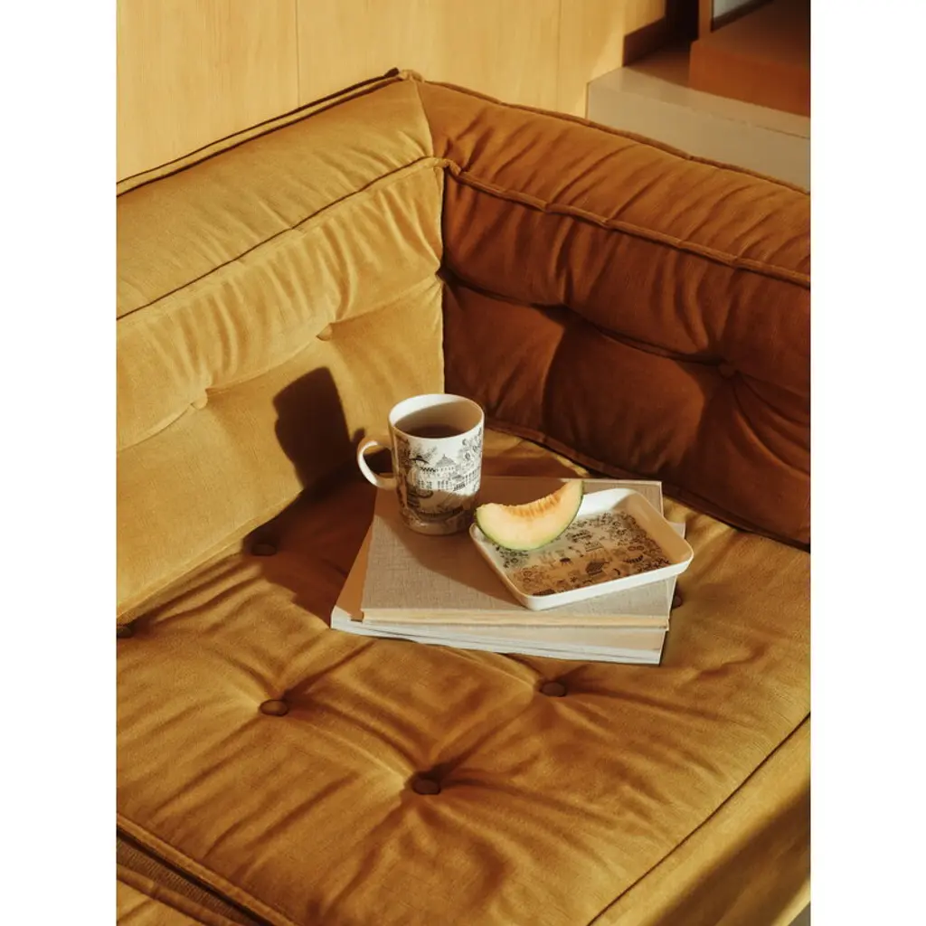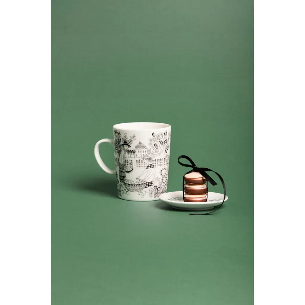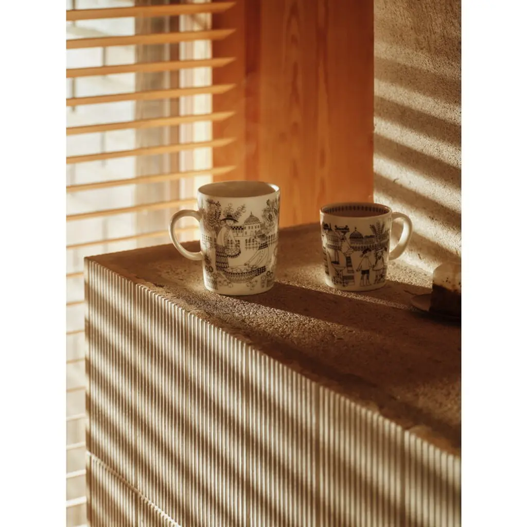 Arabia’s Emilia mug is adorned with a delightful decoration designed by Raija Uosikkinen. She originally created the enchanting Emilia decoration in 1957, and the series was in Arabia's production until the year 1966. Emilia brought a fascinating contrast to the sleek and simple designs of the 1950s, as it was decorated with vines and beautiful details, yet tamed by its black-and-white coloring. Arabia re-launched the enchanting Emilia decoration in 2023. The story goes that the Emilia motifs were inspired by the designer's own Aunt Selma, who lived a relaxed life in America. Elegantly dressed characters spend sunny days in the garden, on a picnic and lying in a hammock. Each part of the Emilia tableware conveys a fabulous breeze of holiday spirit and the leisurely feel of days off.