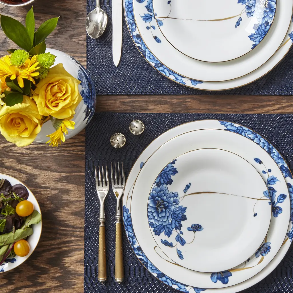 A modern twist on traditional white and blue china patterns, this dinnerware is highlighted by accents of gold to create a lustrous touch of style for your tabletop.