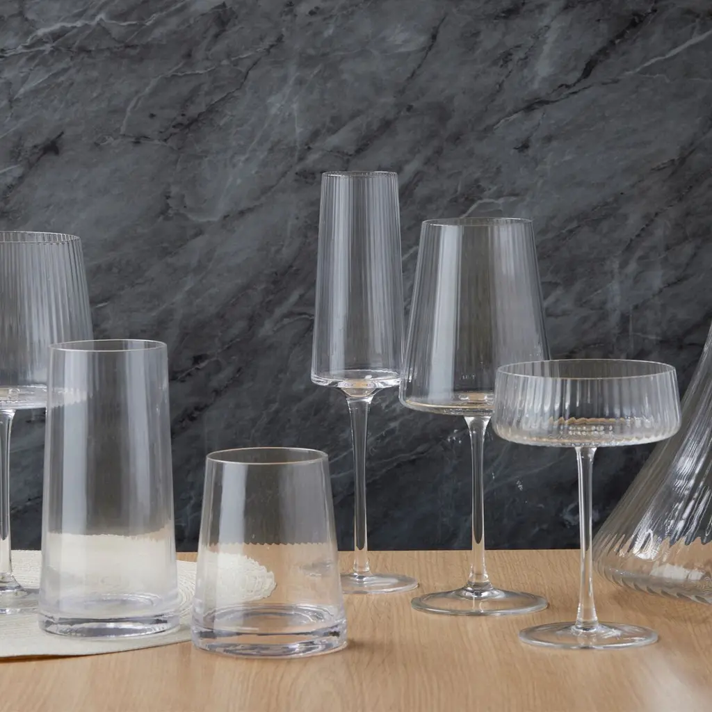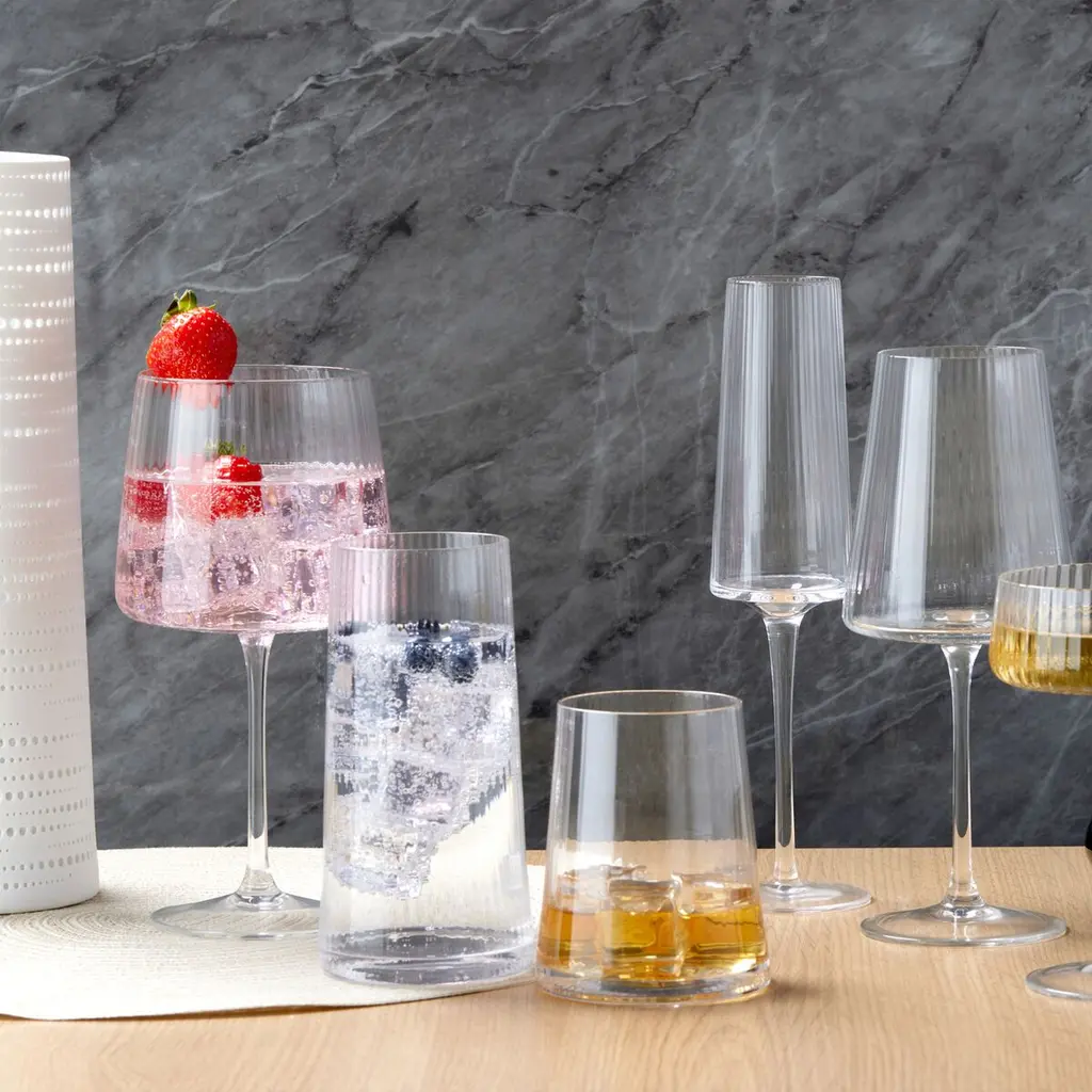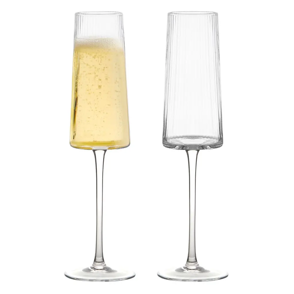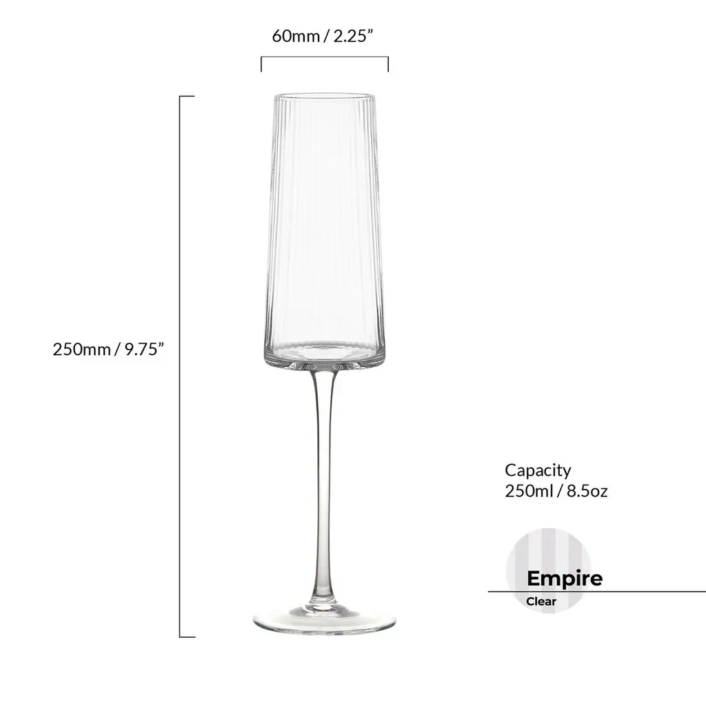 Elevate your celebration with Empire champagne flutes. Handcrafted by skilled artisans, each flute boasts a modern shape with a flat base, rounded corners, and tapered sides. The fine optic running up and down the bowl adds a touch of sophistication. Packaged in a smart gift box, this range includes a full suite of glassware to cater to all your entertaining needs.