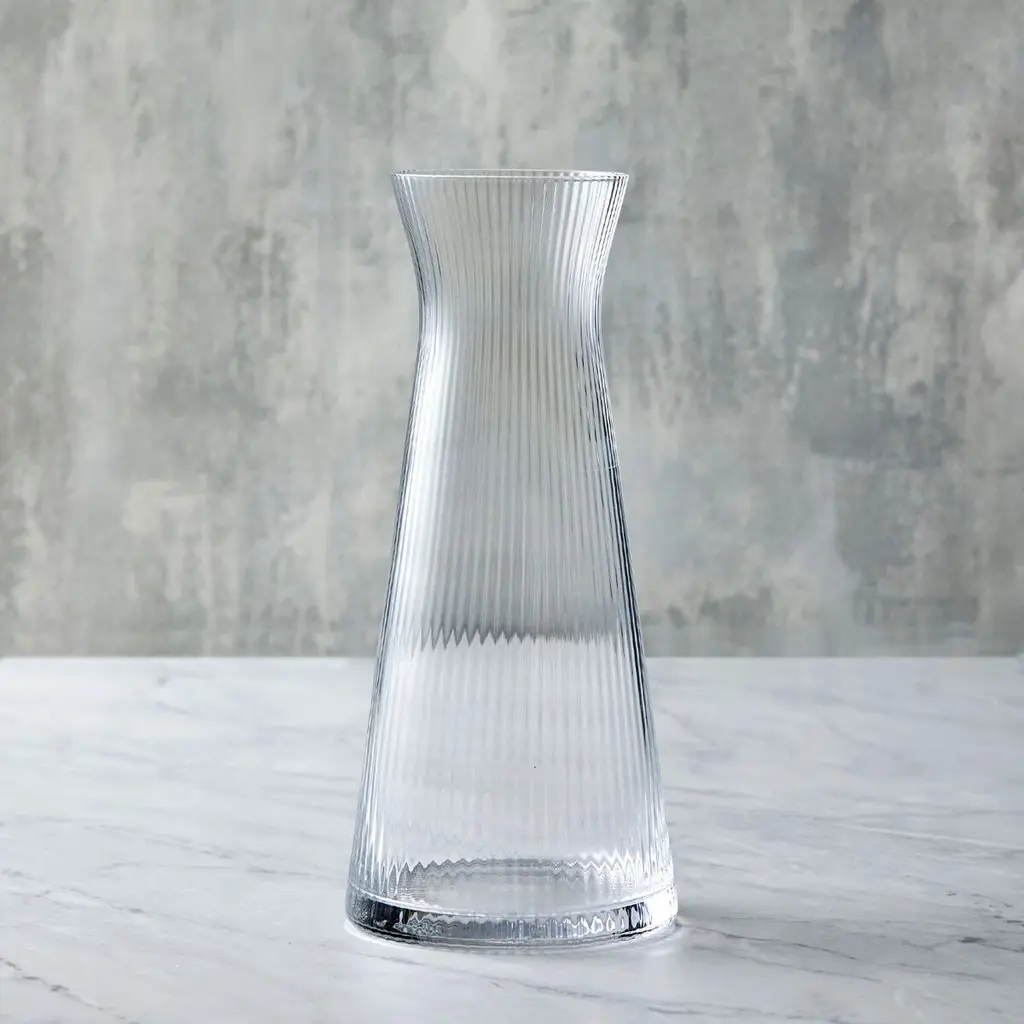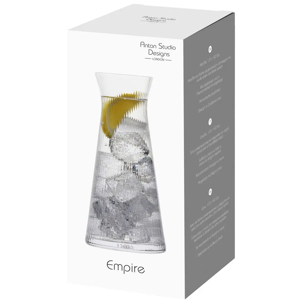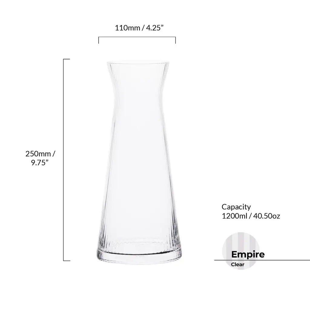 Pour out your water in style with the Empire Water Carafe from Empire Collection. With its contemporary shape and style, paired with its fine optic design, this carafe is great for water, juices, milk and even doubles up as a slender vase. Mouth blown and handmade by skilled craftsmen, this carafe is smartly gift-boxed and makes for a perfect addition to your barware collection. Hand wash recommended.