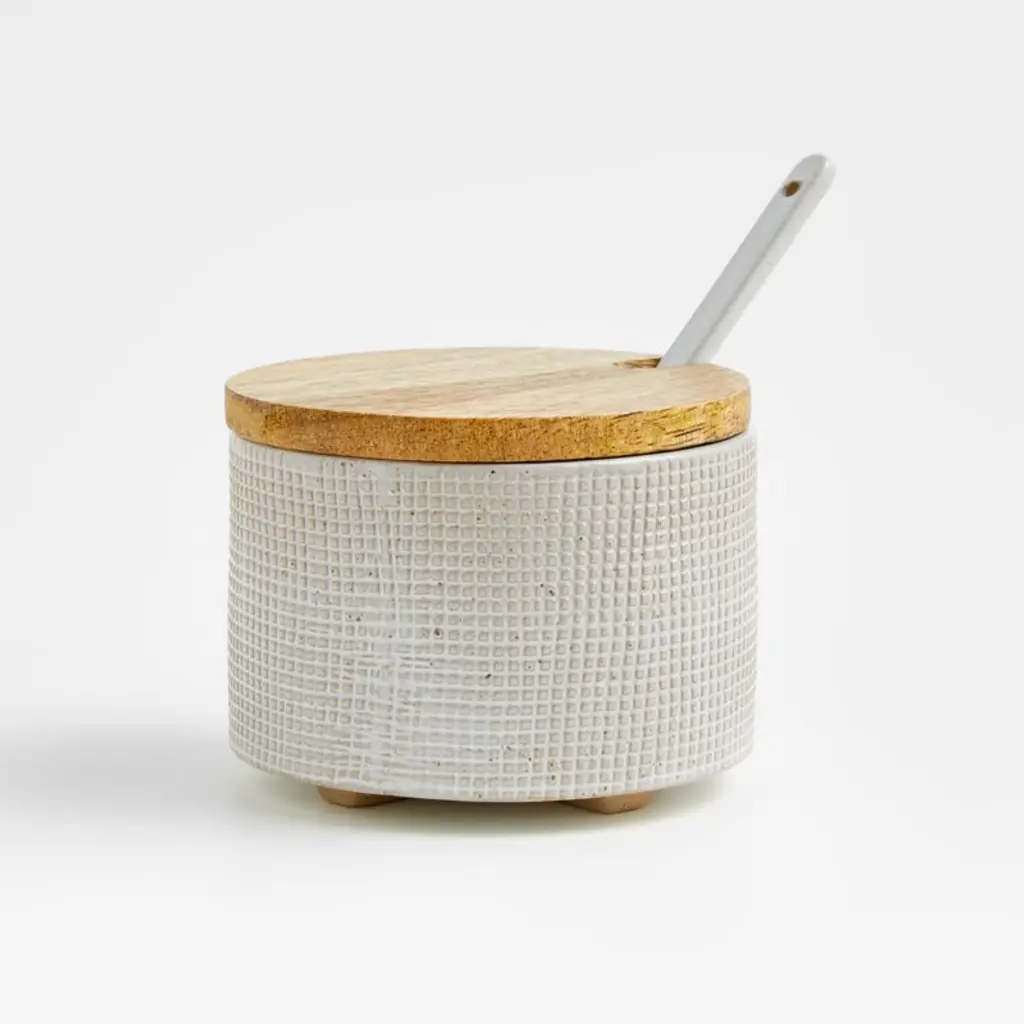 Present flaky sea saltor any other favorite seasoningin charming fashion with our Ena lidded salt cellar with spoon. A fine woven pattern imprints the textured stoneware, finished in a glossy white glaze. Crafted with a cutout for the petite ceramic serving spoon, the mango wood lid offers warm contrast and organic beauty. Our exclusive Ena collection outfits your kitchen in liveable, functional pieces with effortless style.